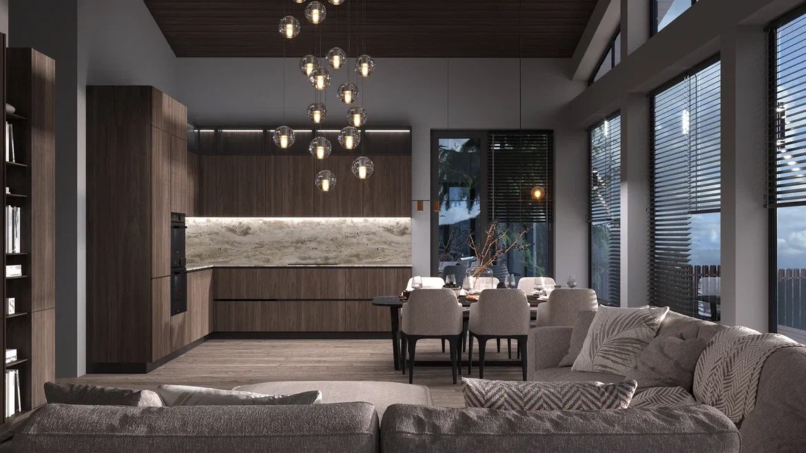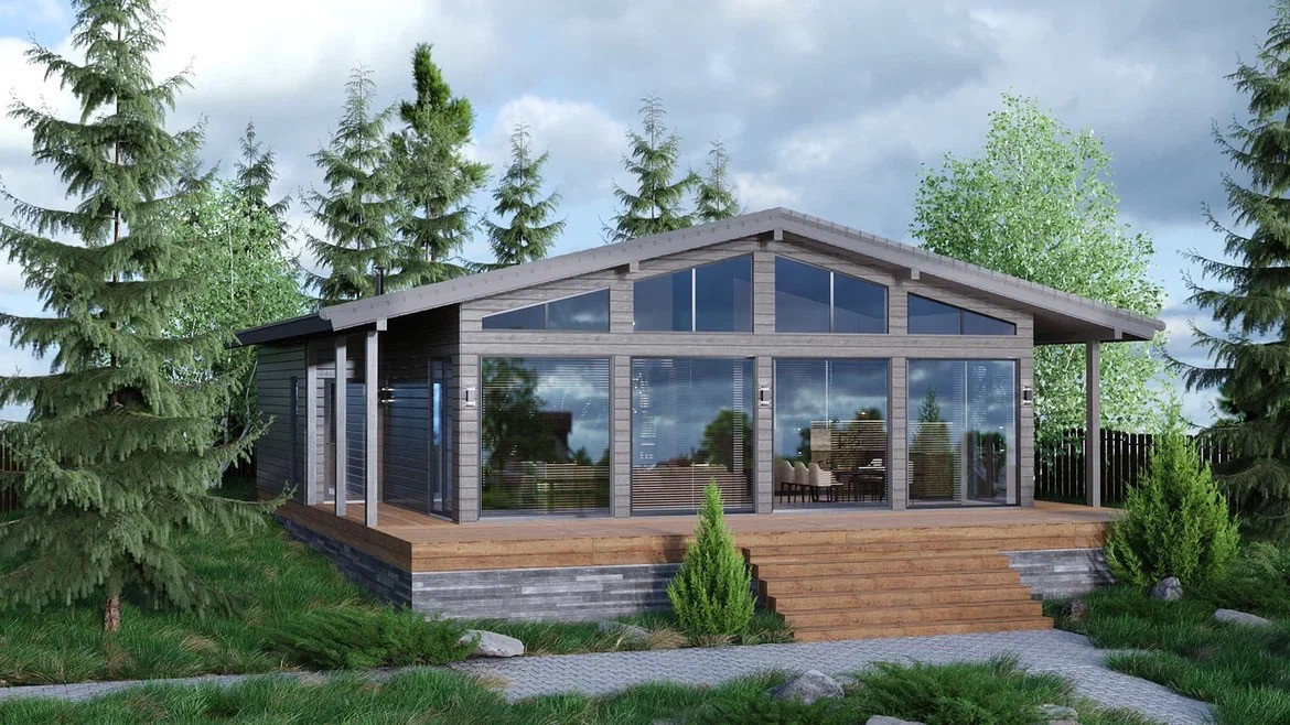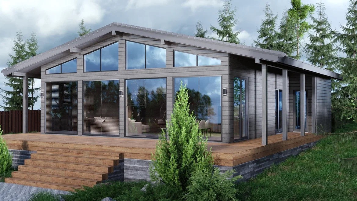 Новый каркасный дом 200 м.кв. С панорамным остеклением в стиле Фарферх. Большая кухня гостиная 50 метров, высота потолков 4.2 м.