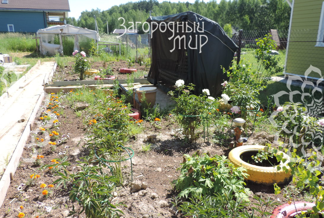 В связи с тем, что дом "молодой", на участке посажены яблоня, груша, саженец смородины, малины, также кусты пионов и других цветов.
