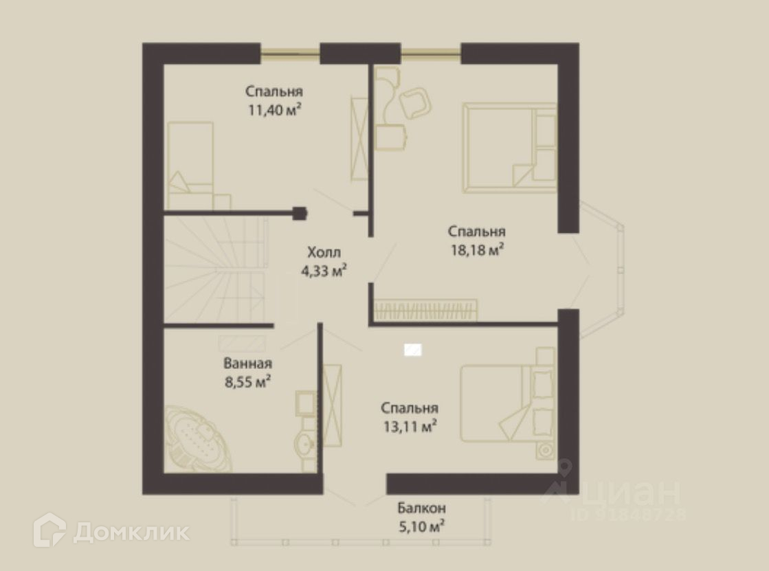 2 этаж- 3 спальни с натяжными потолками и дизайнерским ремонтом, санузел, одна из спален с выходом на большой балкон с прекрасным видом на хвойный лес.