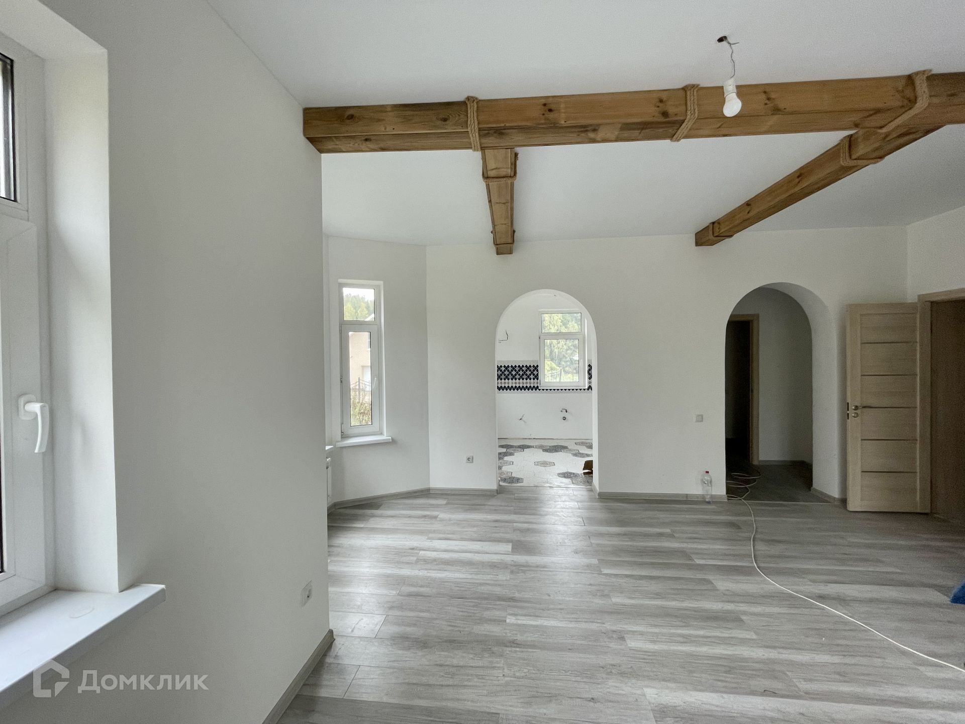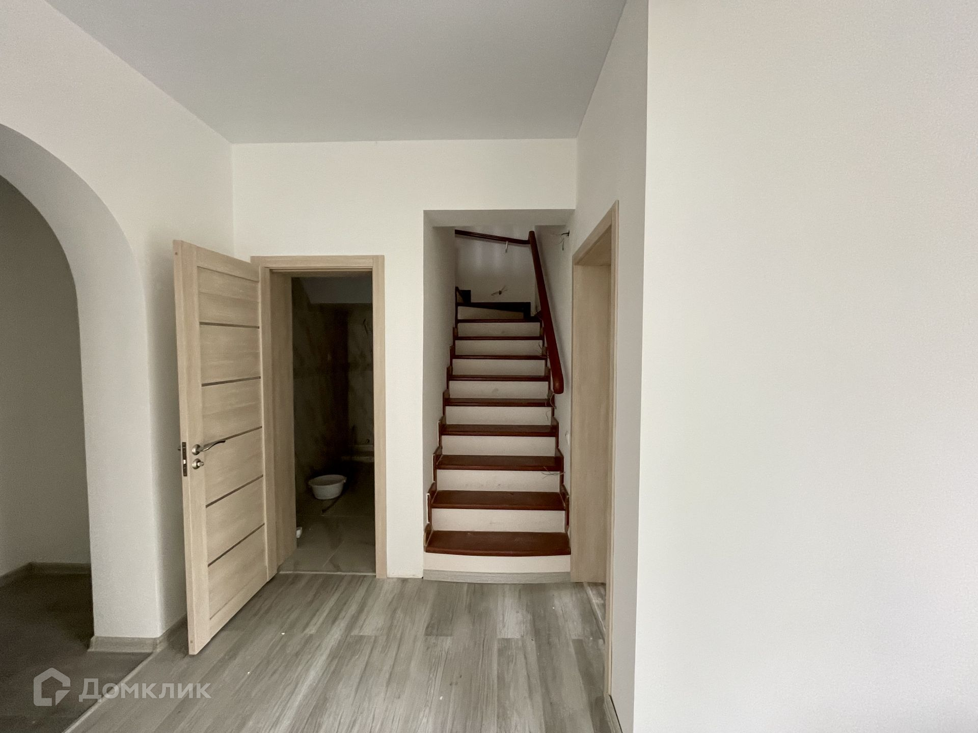 1 этаж - кухня с переходом через арку в гостиную с выходом на террасу, спальня, санузел, бойлерная, прихожая, деревянная каркасная лесница на 2 этаж.