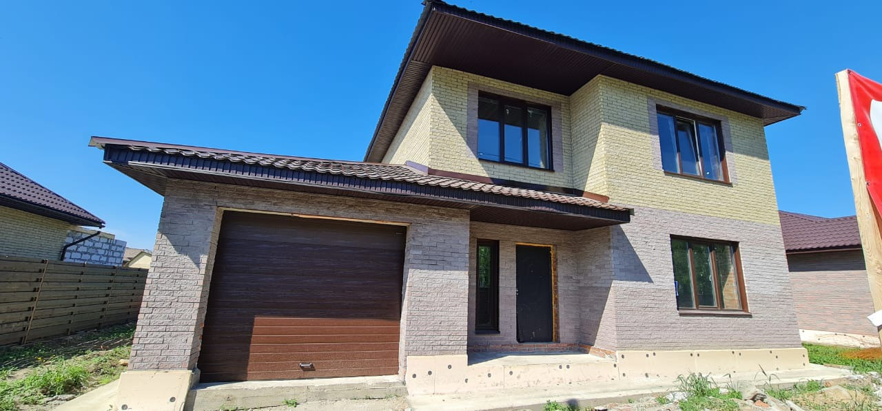 Кирпичный дом с террасой 12м2 и гаражом 22м2. В доме 4 спальни, кухня и гостиная, 2 с/у.