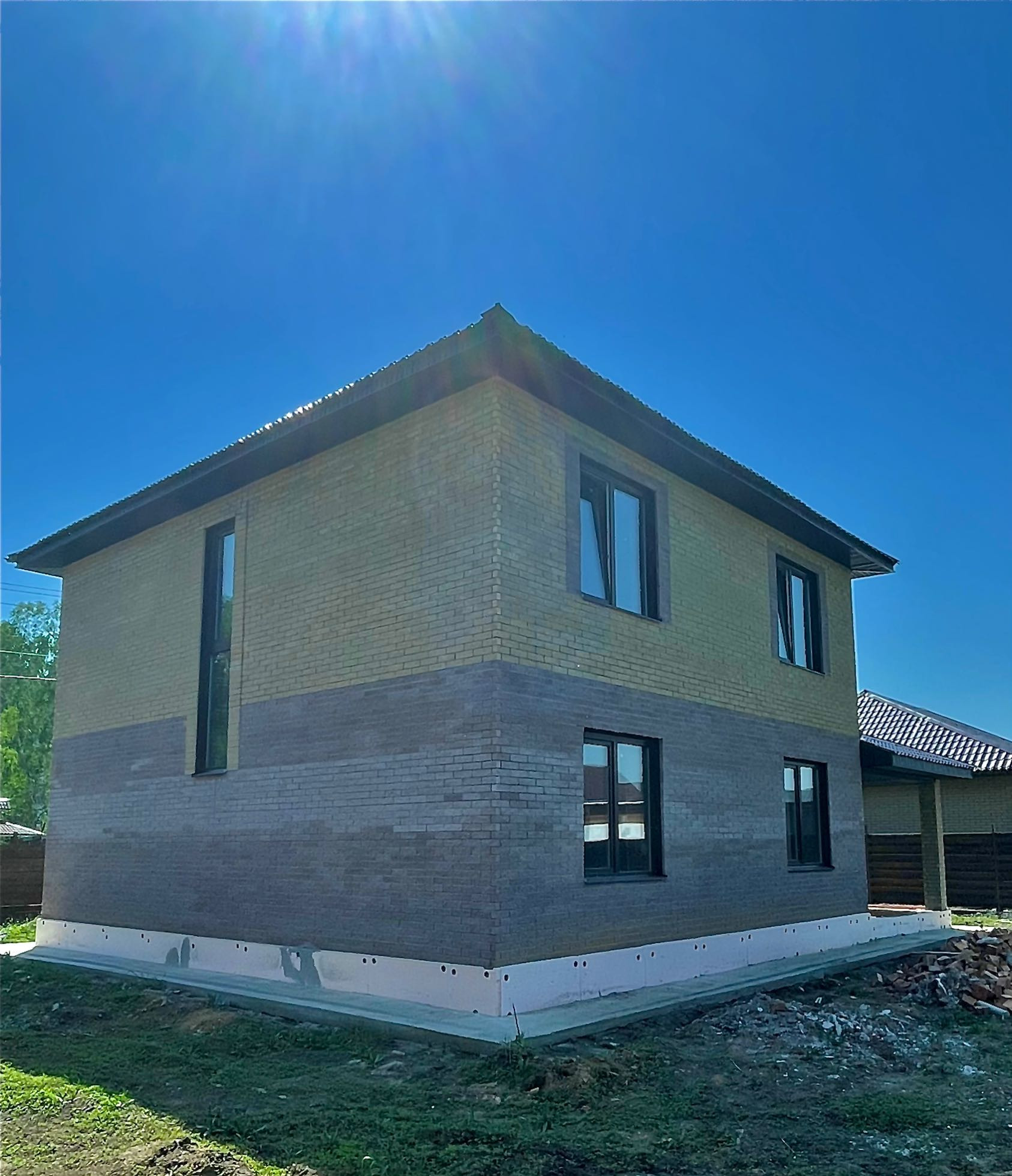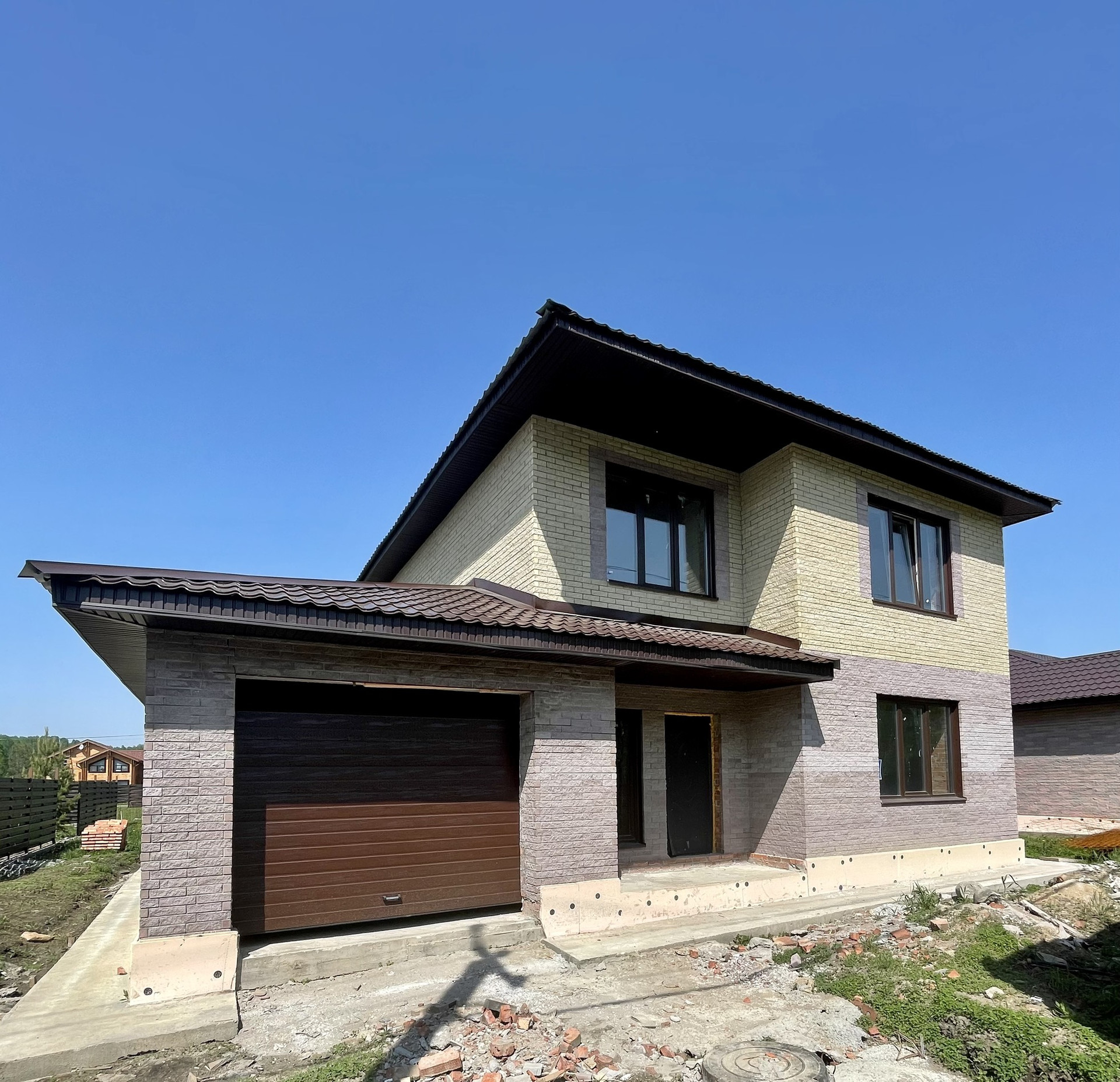 Сам дом на моноплите, кирпичные стены и перегородки, дорогой облицовочный кирпич Брикстоун, крыша с утеплением, ветро-влагозащитой, металлочерепица. Свет, вода, септик, газ есть. Красивый коттеджный поселок, озеро, лес, собственный зоопарк, асфальтовая дорога.