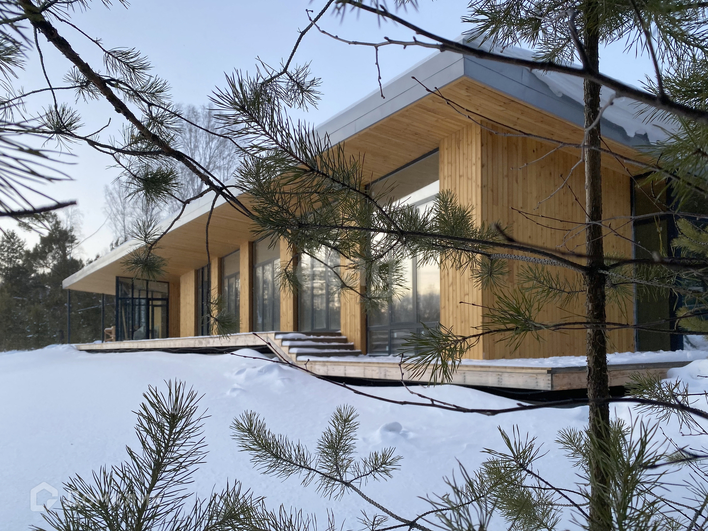 Дом, наполненный солнцем, баня, зона барбекю с видом на сосновый лес, гараж и котельная - все это объединено под одной крышей. Общая площадь комплекса 170 м2.