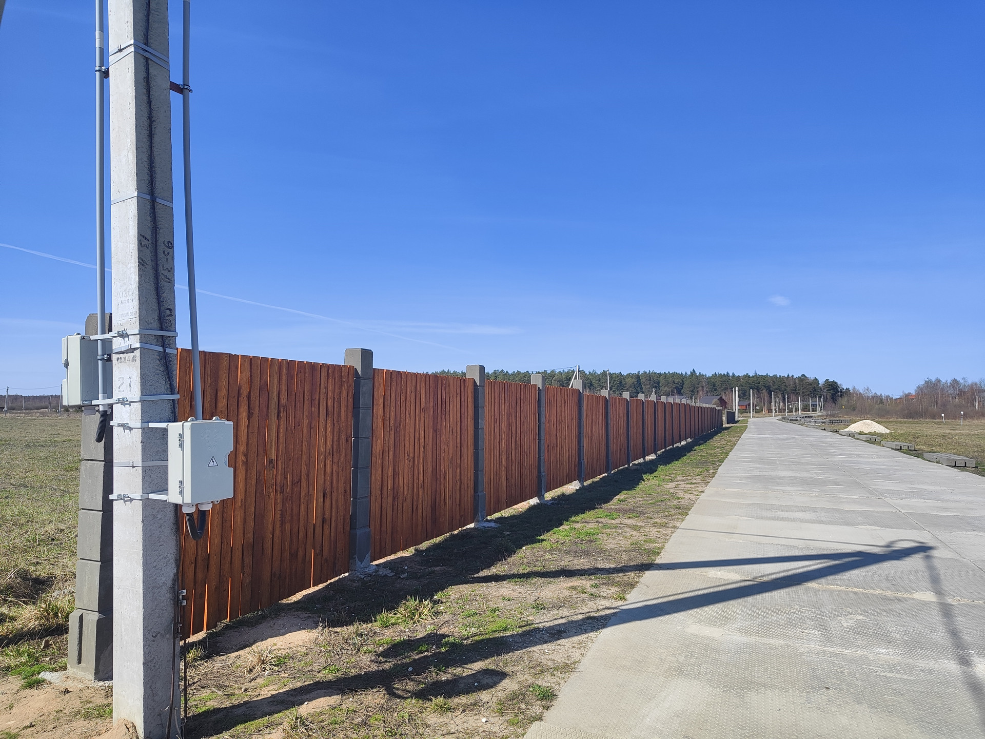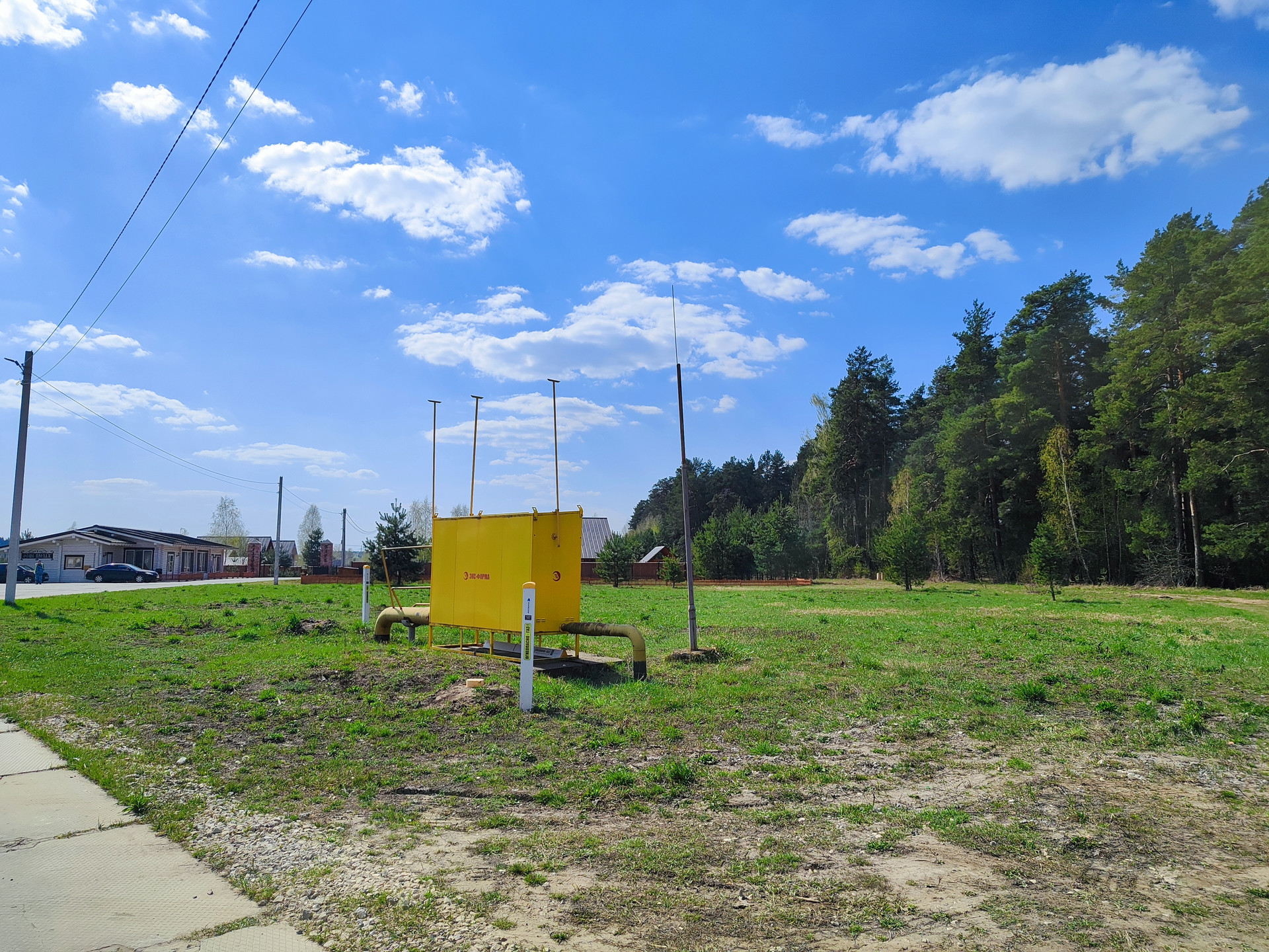 По границе участка, газ, электричество. Дорога асфальт, проложены внутрипоселковые дороги.