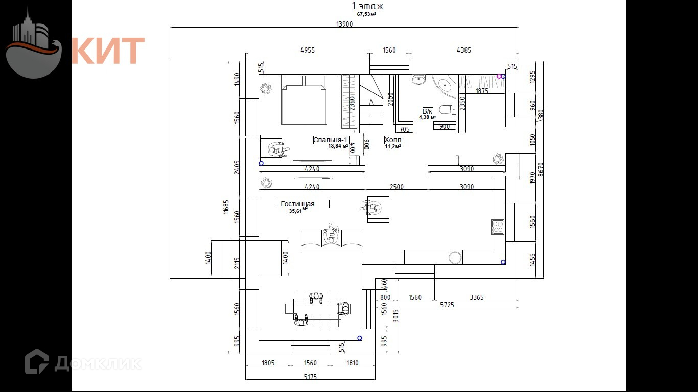 - На первом этаже расположен санузел, просторная прихожая, большая кухня-гостиная со столовой, гостевая спальня;