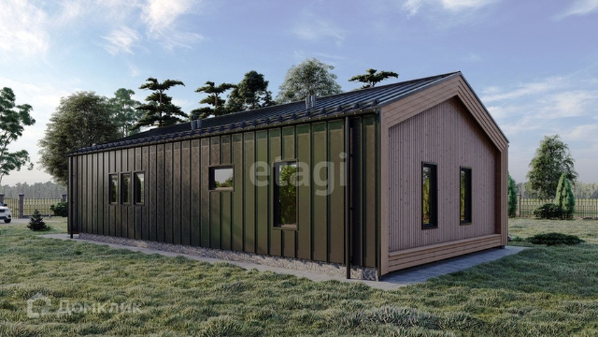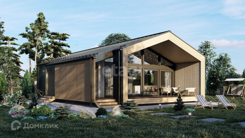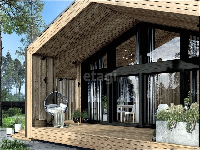 В стоимость входит : клик. фальц + планкен с заводской окраской, Кровля клик.фальц, Ламинация окон , Вертикальные рейки с заводской покраской, Эффект "Парящая терраса".