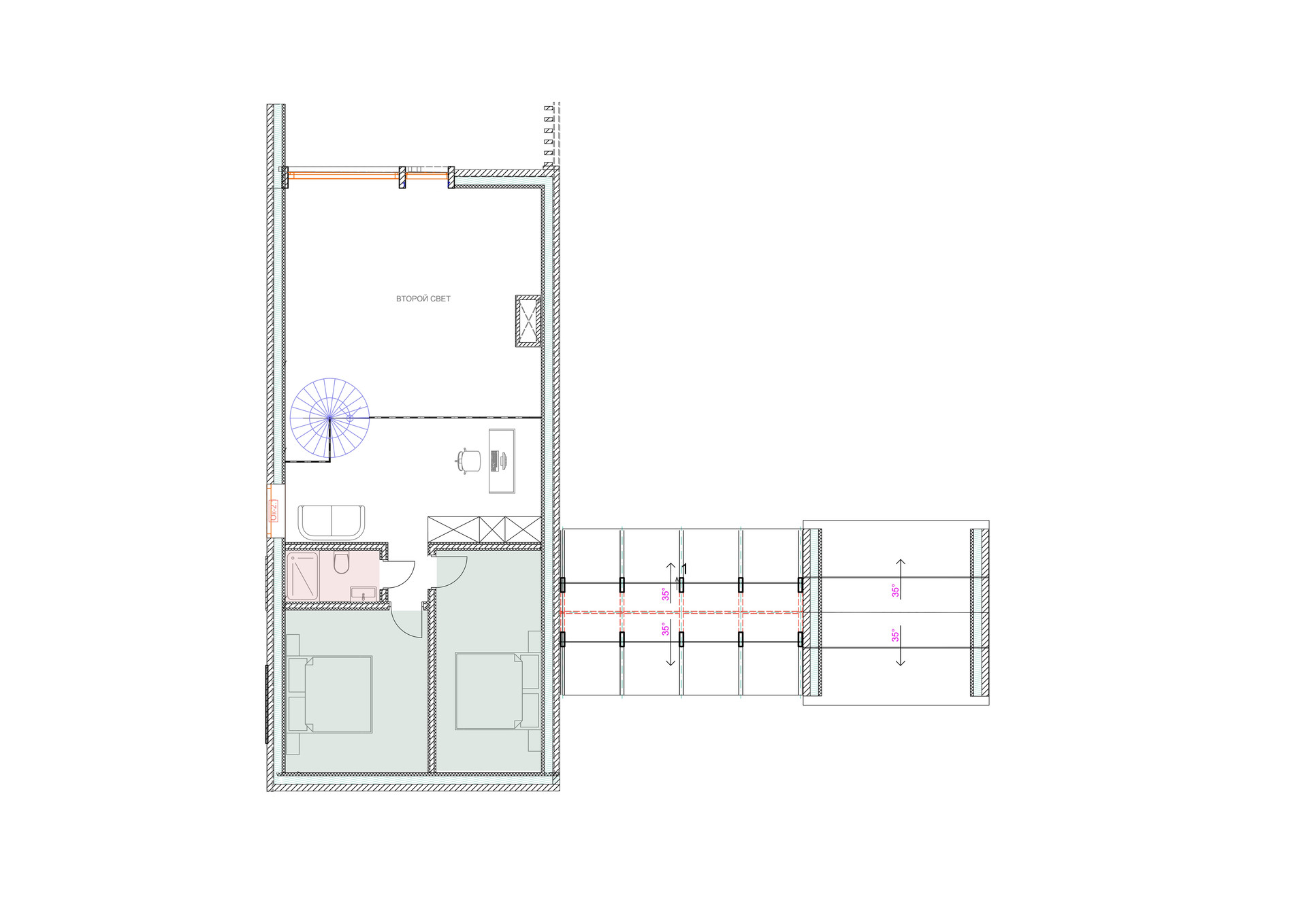 Две спальни (9 м2 и 10 м2) . На втором этаже имеется собственный с/у.