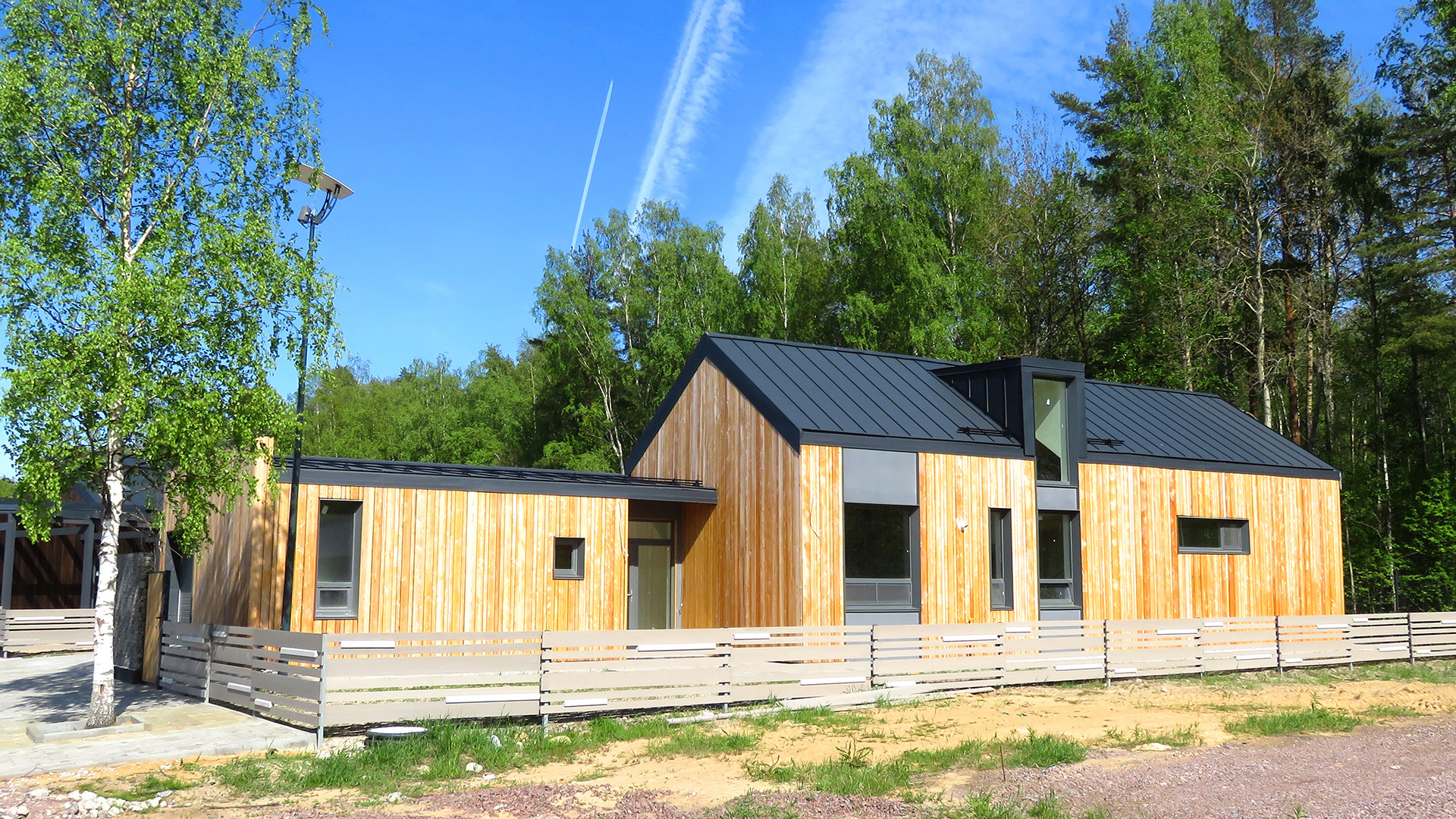 Дом расположен в поселке «Лес и Пляж». Поселок является закрытой территорией с собственной службой охраны и видео-наблюдением, кроме того всегда доступны услуги консьерж-сервиса. Выдержан единый архитектурный стиль Modern Barn House, асфальтированные дороги, собственный парк на территории.