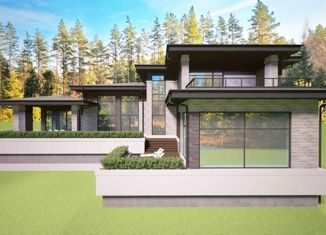 ID 10 410. Лес и река. Загородный дом с отделкой площадью 490 м² расположен на полевом участке с рельефом 21 сотка. Фасад в современном стиле облицован деревом и белой штукатуркой и декорирован геометричным рисунком. Внутри коттеджа разметили 5 спален, кухню-столовую-гостиную, гостевой блок с мини-кухней, гараж на 2 машины. На участке выполнен ландшафтны... |