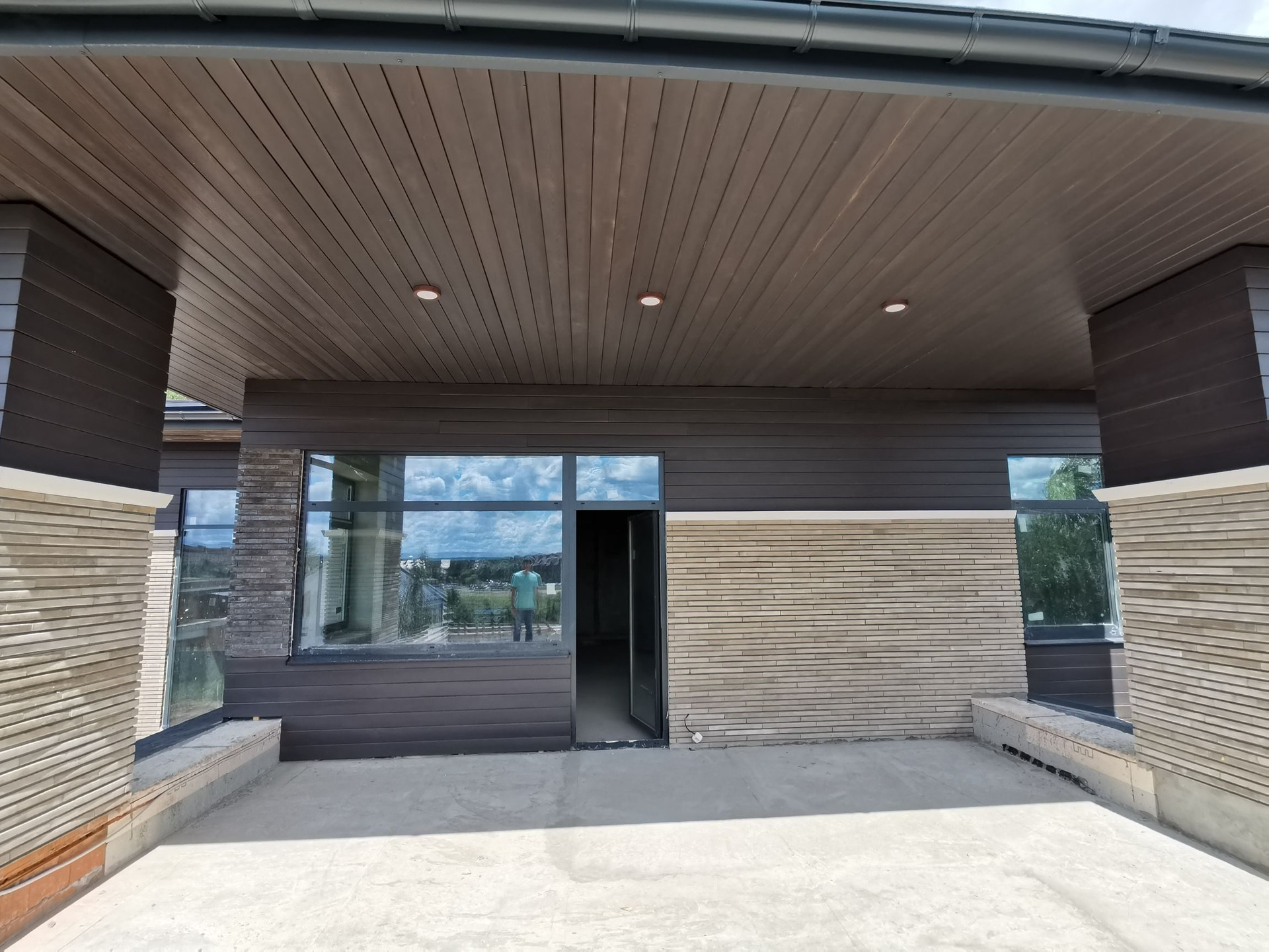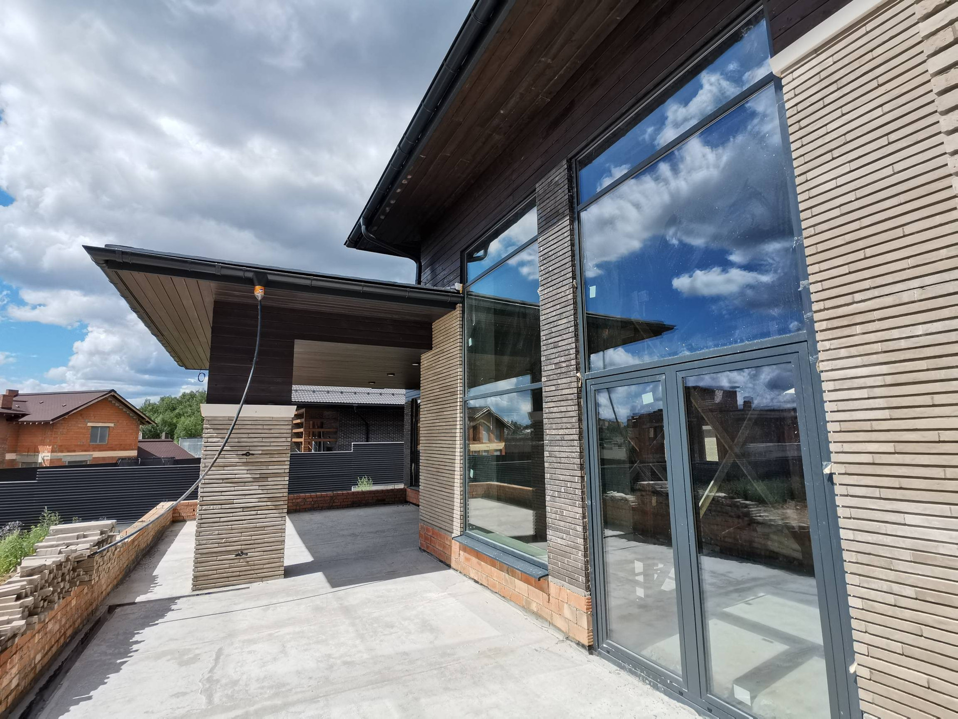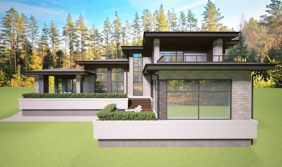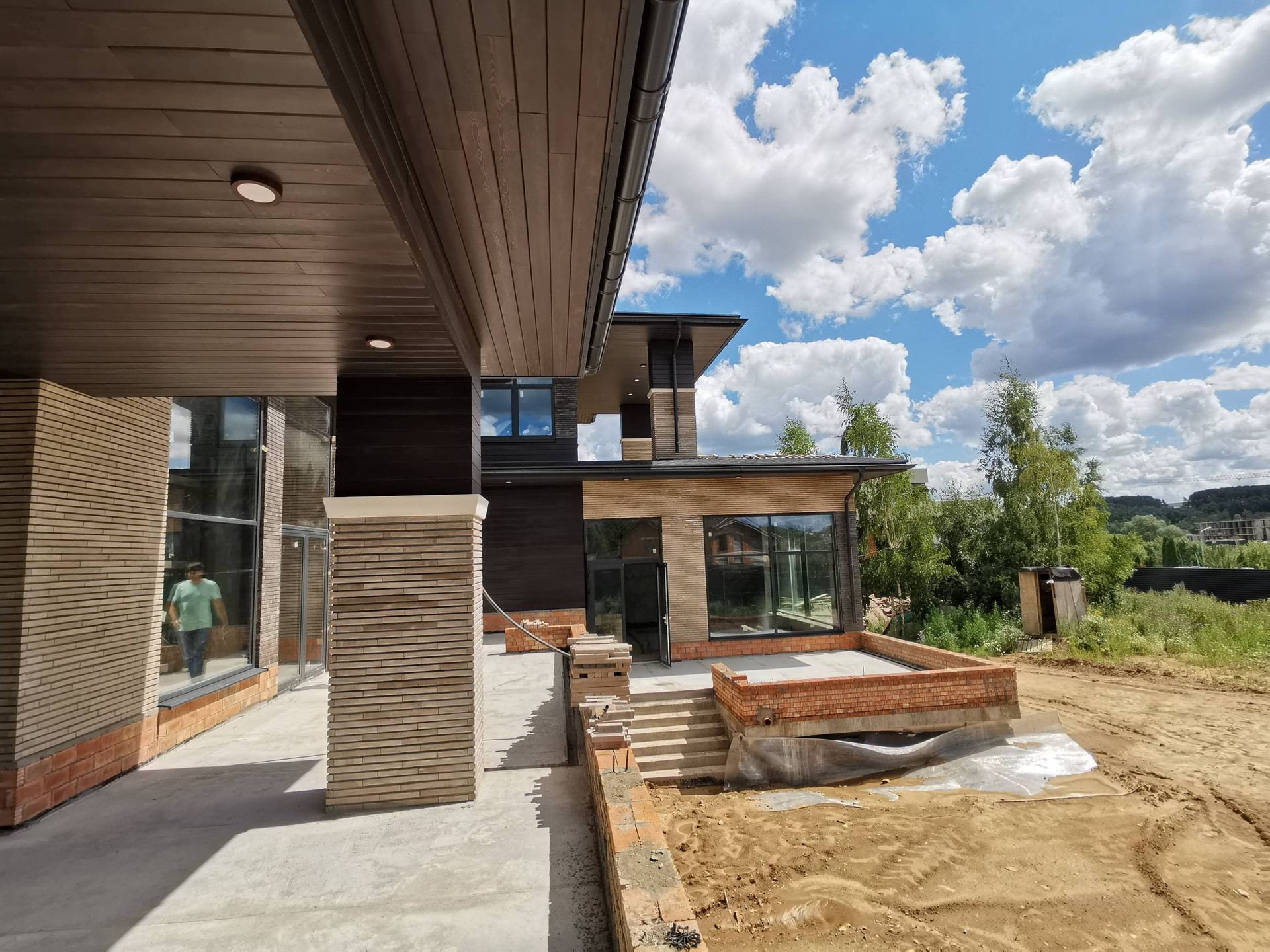 Фундамент ленточный с обратной засыпкой, стены наружние и внутренние несущие из щелевого керамического кирпича 440мм, отделка фасада из удлинённого клинкерного кирпича и лиственницы.