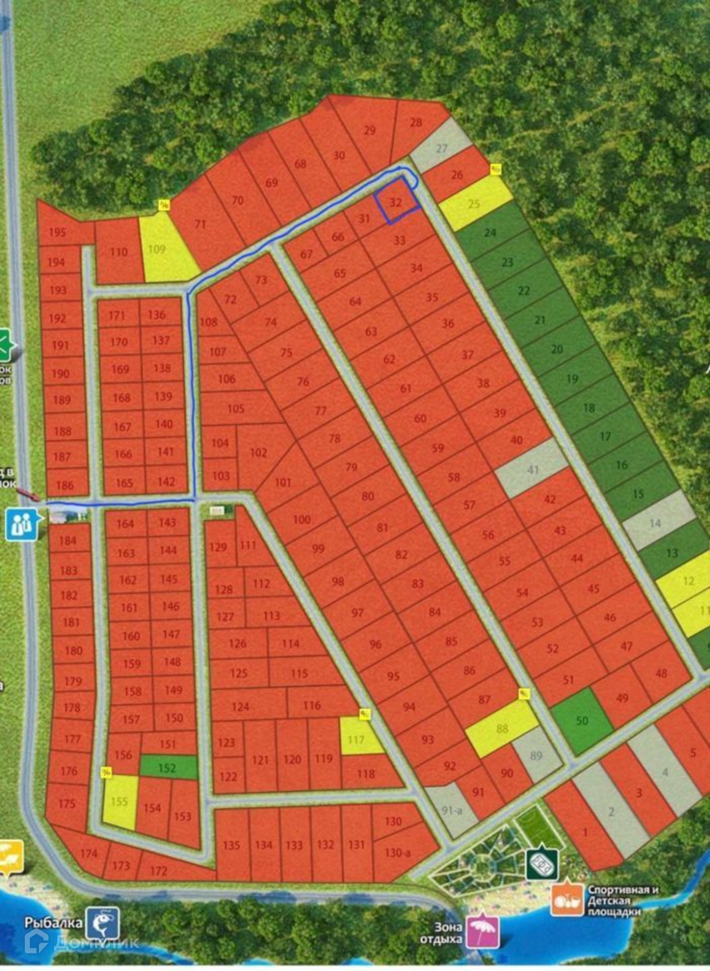 Подъезд к поселку осуществляется по асфальтированной дороге, что обеспечивает удобный и безопасный доступ к дому. В посёлке имеется зона отдыха с пляжем, спортивные и детские площадки, зона для рыбалки.