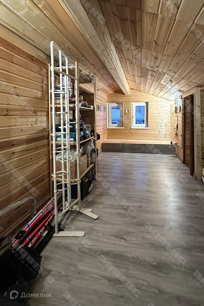 - "Мансардный потолок" под 4 метра, обшитый имитацией бруса;
