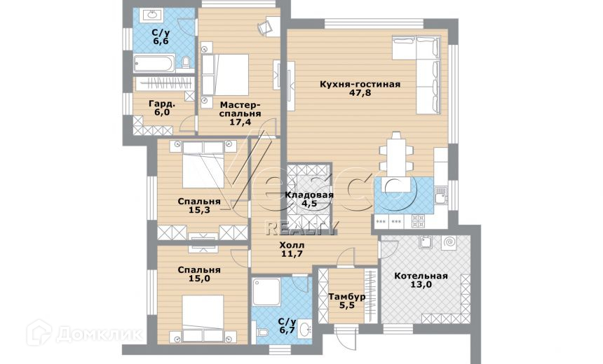 Просторная гостиная-кухня (48) с кладовой для продуктов (5), мастер-спальня (17) с гардеробной (6) и ванной комнатой (7), две спальни (по 15), общий с/у (7), холл (12), тамбур (6), котельная (13).