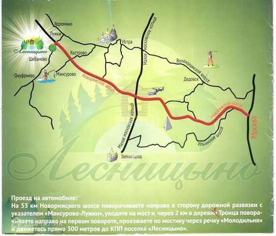 От МКАД по Новорижскому шоссе 55 км, ещё от самой Новой Риги до участка 3 км. От г. Истры ходит общественный транспорт, пешком до автобусной остановки примерно 1 км.