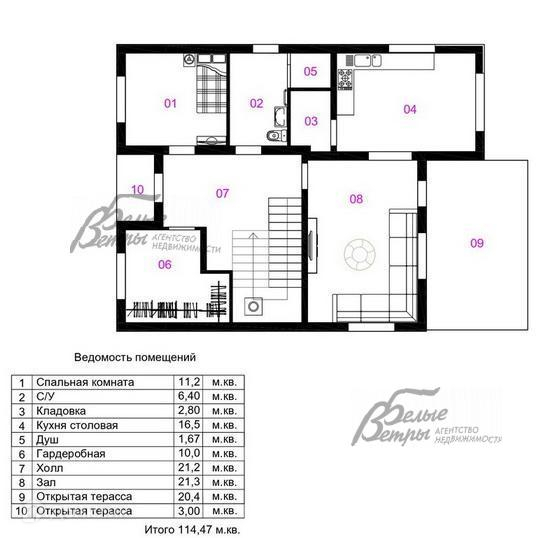 1-ый этаж: крыльцо 5 кв.м, холл 34 кв.м, гардеробная 5,5 кв.м, кухня-столовая 29 кв.м с кладовкой 4 кв.м, гостиная 30 кв.м с выходом на террасу 18 кв.м, спальня 17 кв.м, санузел с душевой 12,5 кв.м с постирочной и котельной..