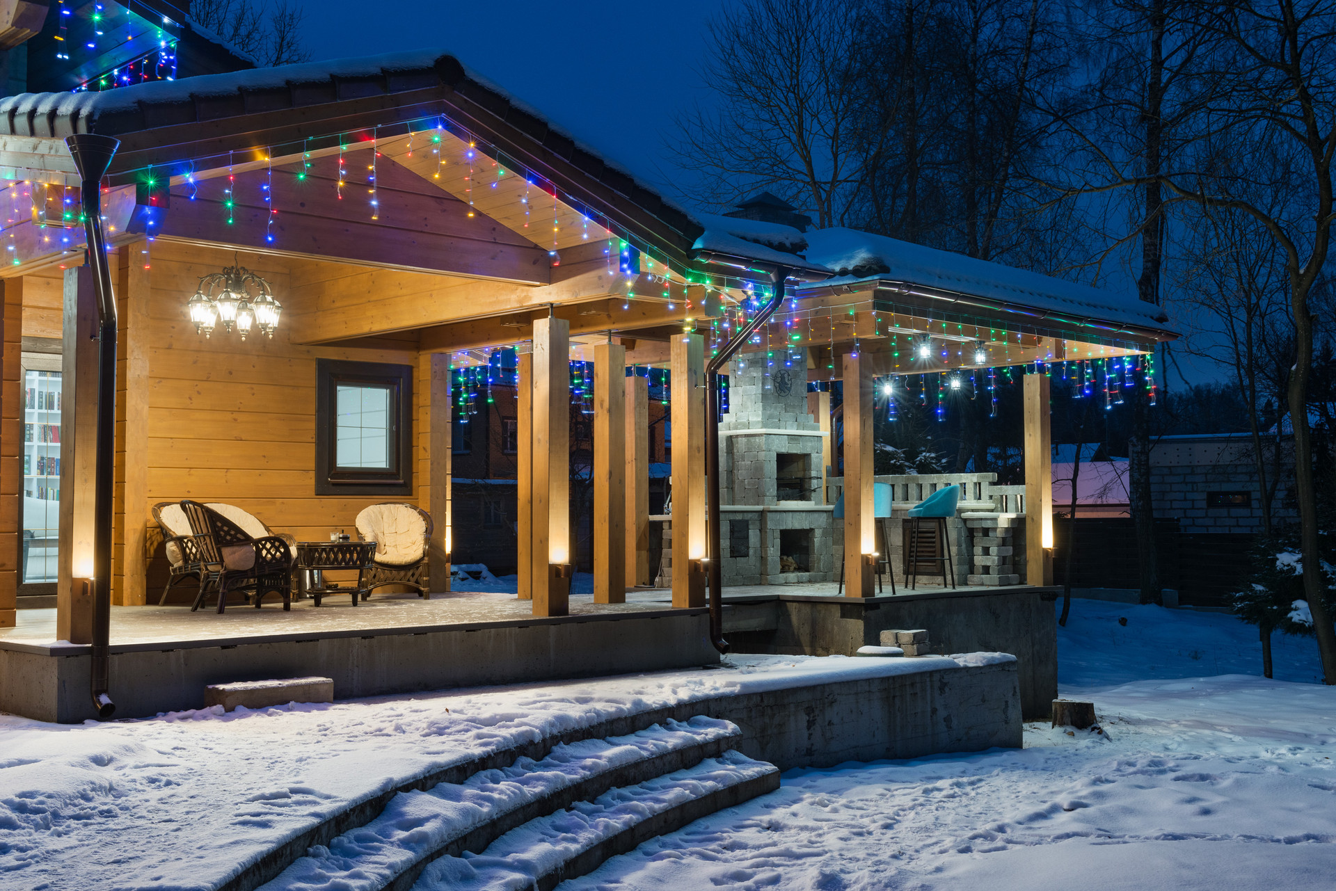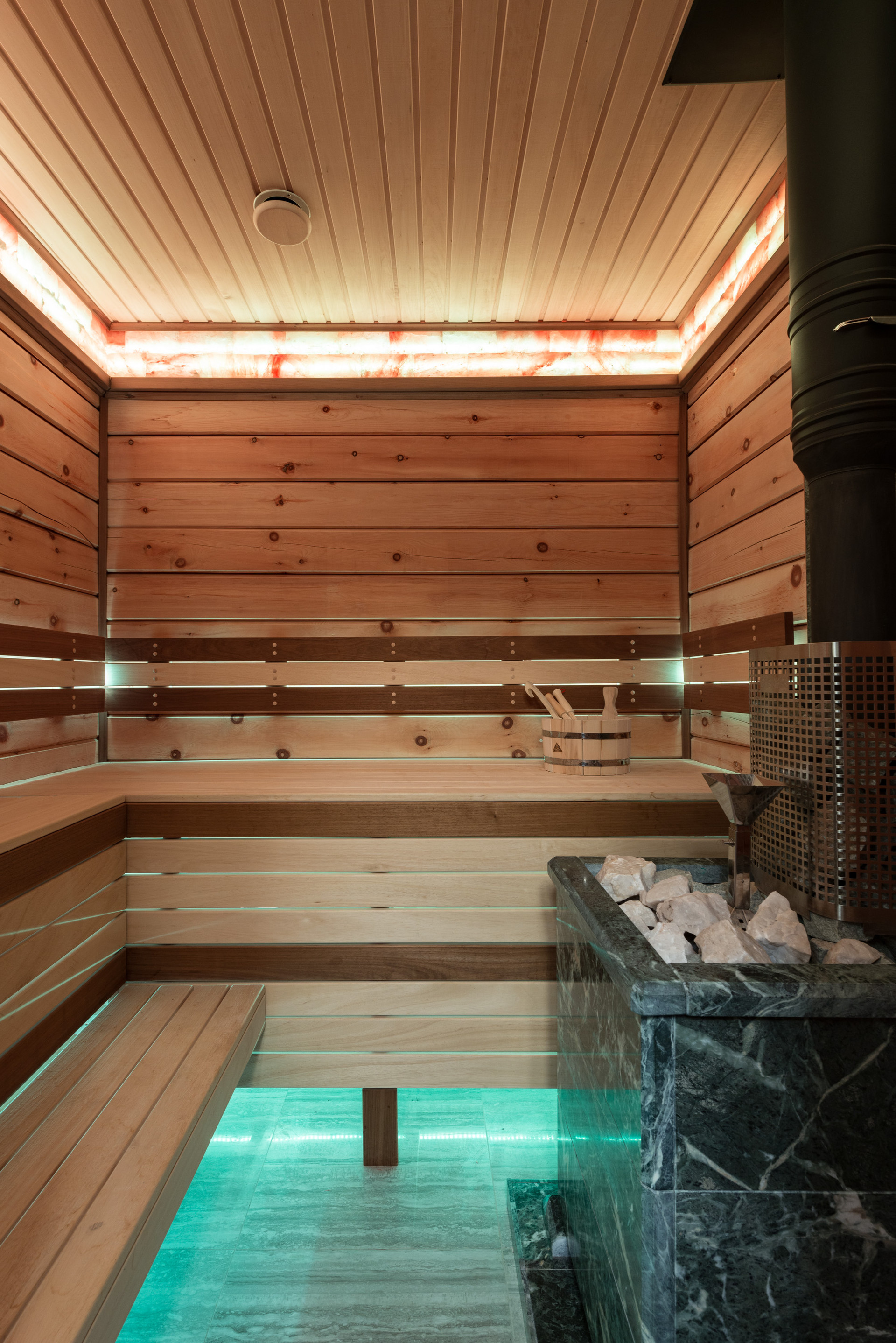 Гостевой дом-баня из кедра, площадью 90 кв.м  может использоваться как для проживания гостей, так и для непосредственно банных процедур. Два парных отделения - сауна, по периметру которой сделана полоса из слэбов гималайской соли, и хаммам с высокой каменной чашей.  Для проживая дом оборудован кухонной зоной, комнатой отдыха с камином, а также теплой террасой с видом на живописную часть участка, спускающуюся в овраг.