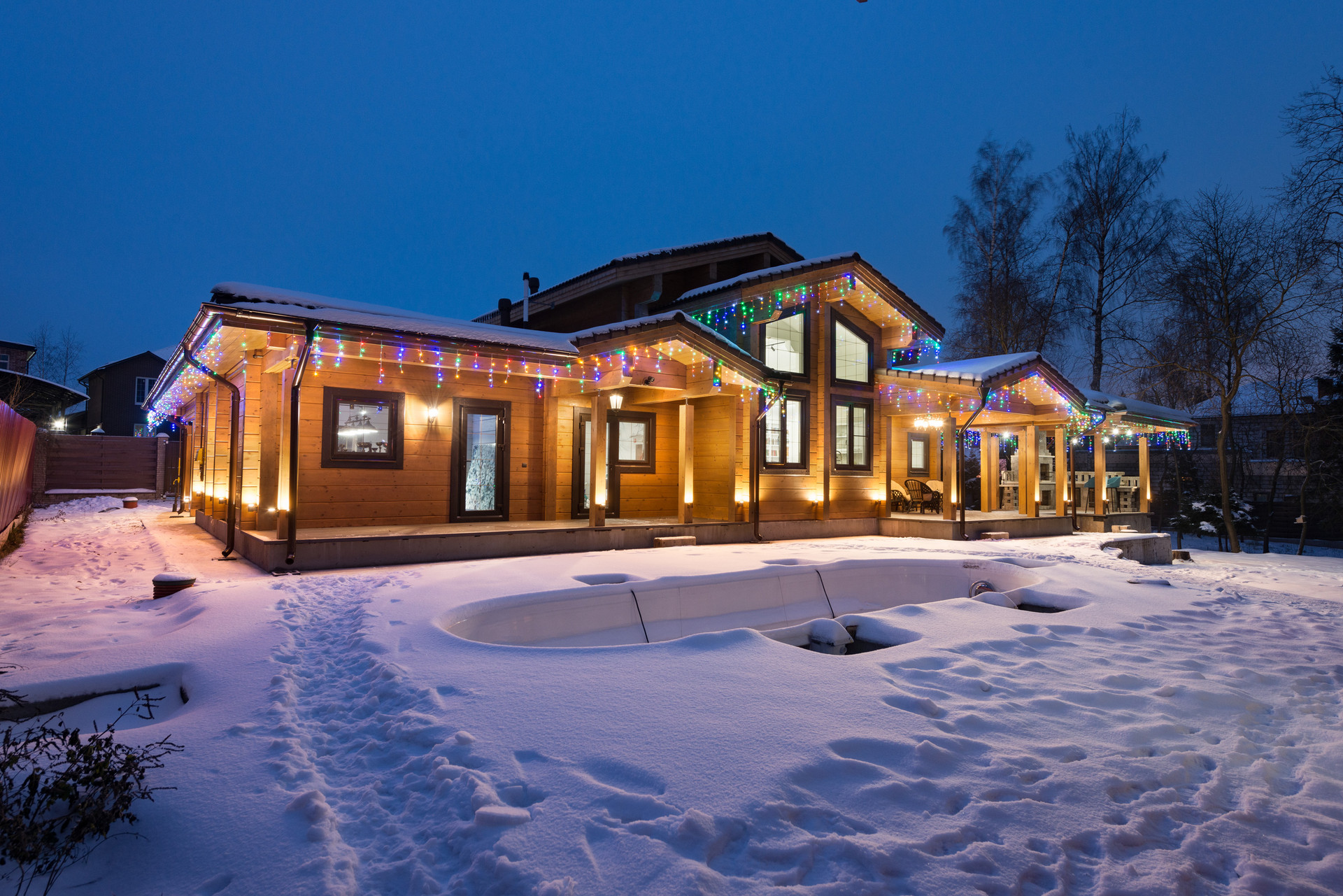 Открытый бассейн, расположенный между домами, имеет систему подогрева, гидромассажа, искусственных волн и рециркуляцию воды.