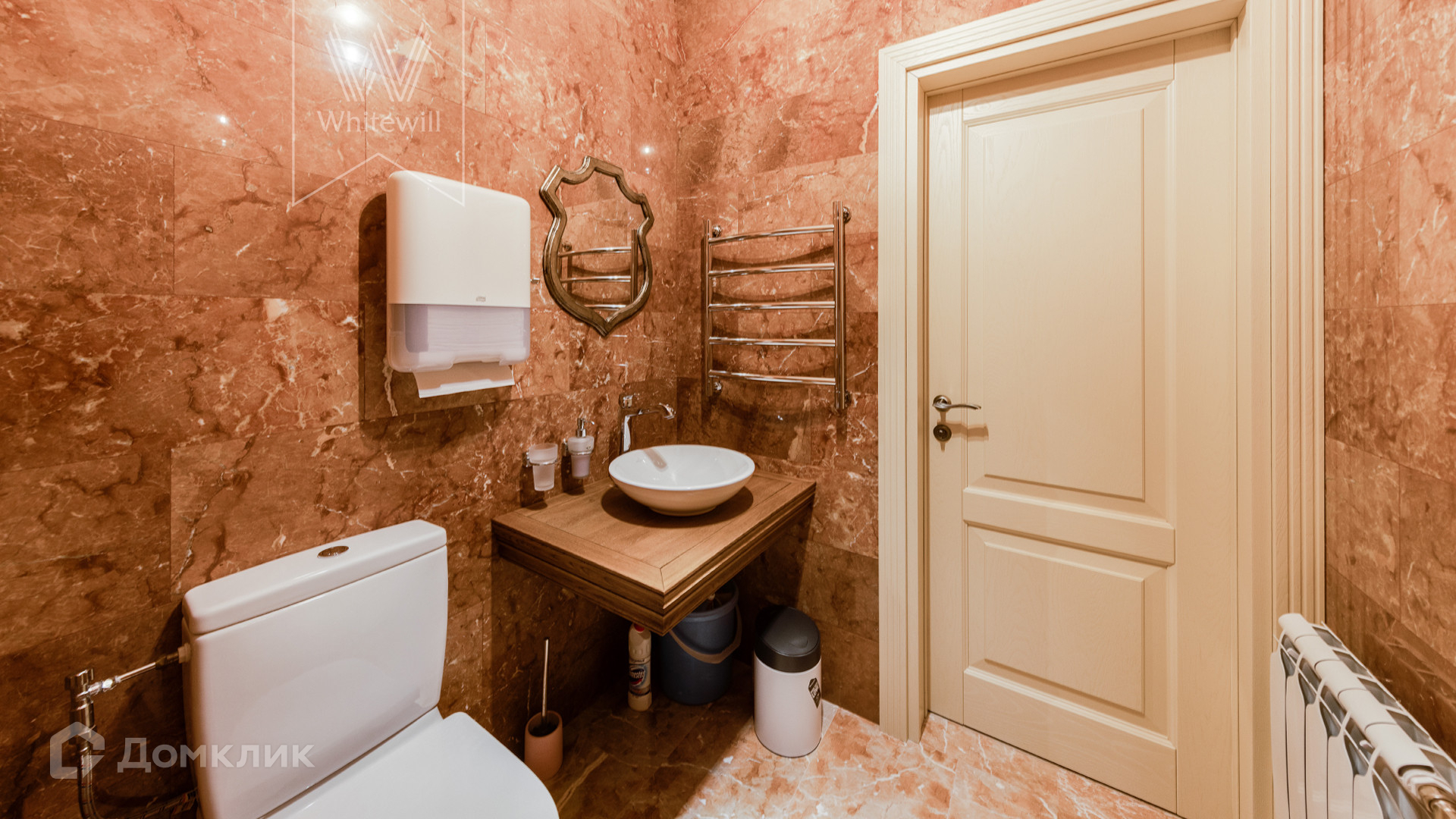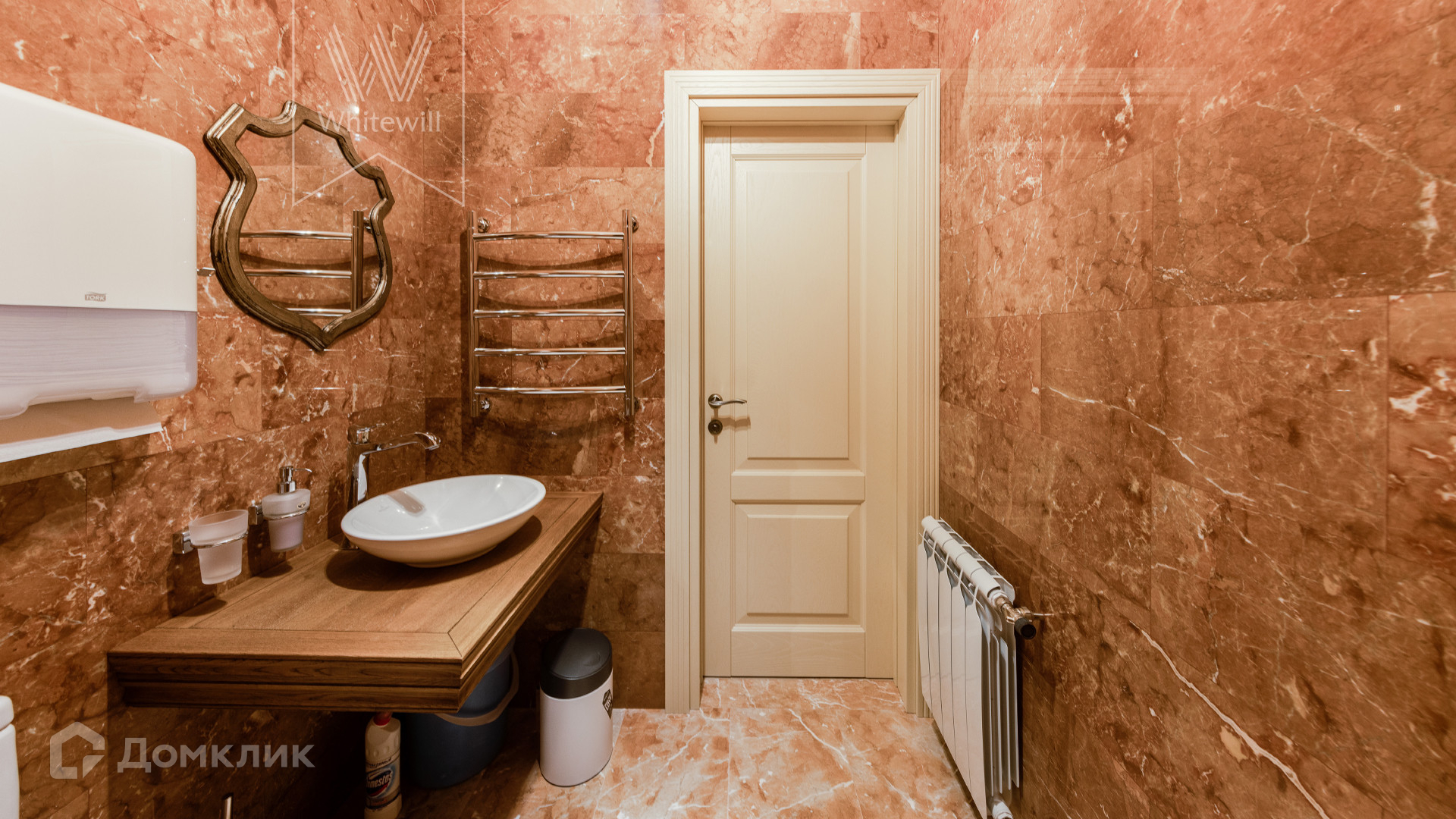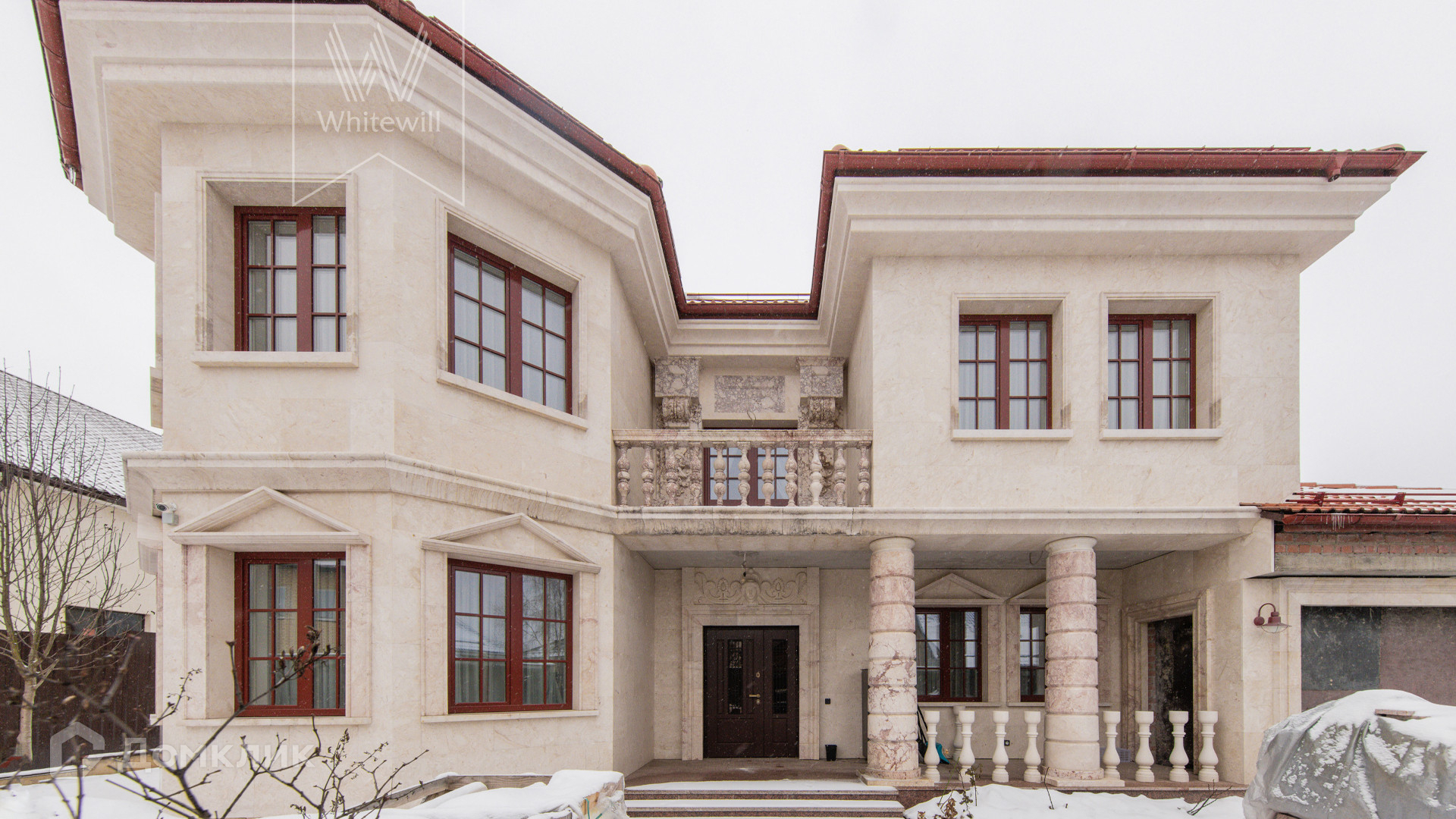 ID 11 267. Лесной пейзаж-2. Загородный дом площадью 288 м² постороен на полевом участке 8 соток. Вентилируемый и утепленный фасад выполнен в классическом стиле, облицован натуральным мрамором Crema Nuova и гранитом по цоколю Maple Red и декорирован элементами ручной резьбы по камню. В интерьере использованы текстильные обои и краска, мраморизованный известняк Jura Beige и инженерная доска из американского ореха на полу, карнизы и розетки из натурального гипса на потолке, санузлы отделаны натуральным ониксом и мрамором, итальянской плиткой, установлены сантехника Villeroy & Boch, межкомнатные двери из массива дуба, мраморные подоконники Prestigio brown. Планировка коттеджа включает 4 спальни, кухню-столовую с выходом на летнюю террасу, сауну из липы с комнатой отдыха, винный погреб, квартиру для персонала с отдельным входом и гараж. На участке выполнен ландшафтный дизайн, высажены деревья и кустарники, засеян газон, вымощены дорожки и обустроена беседка.