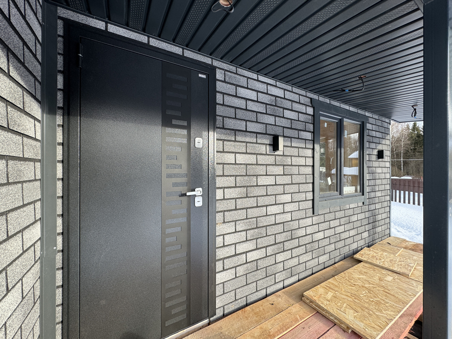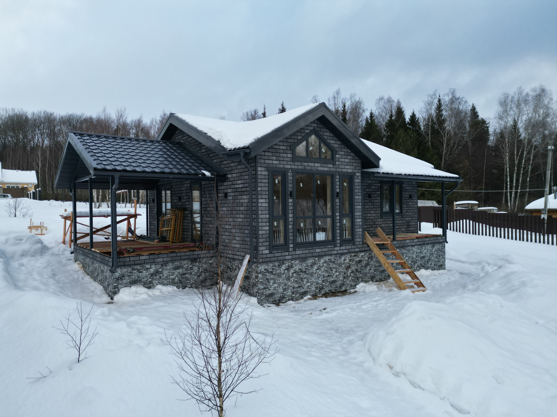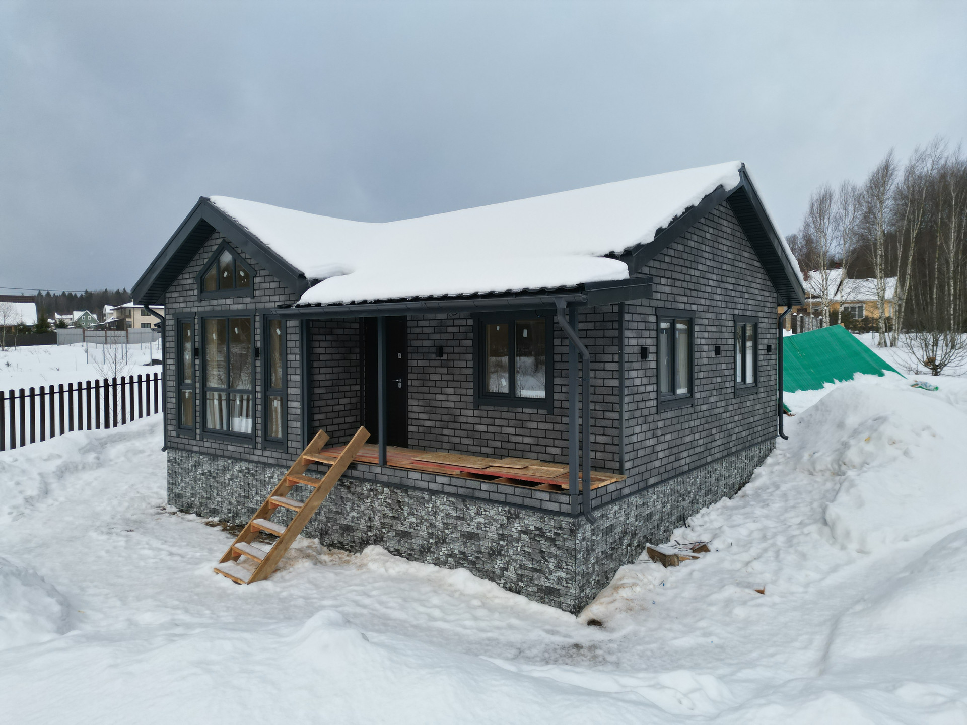 Фундамент – свайный с отделкой цоколя. Материал стен - каркас с утеплением 200мм; Внешняя отделка - ОСБ панели + фасадная плитка «Хауберк» Технониколь; Внутренняя отделка - обработанная имитация бруса; Окна - двухкамерные стеклопакеты Rehau; Кровля - металлочерепица с утеплением 150 мм; Полы - ламинат.