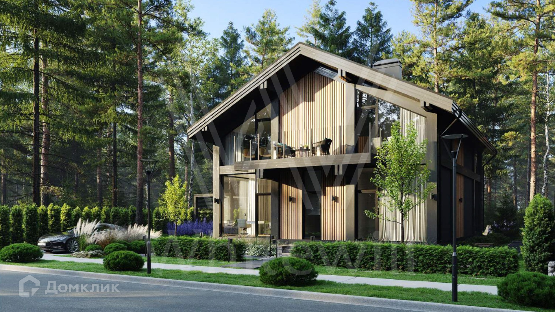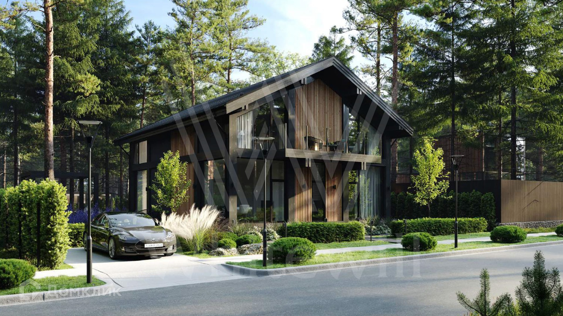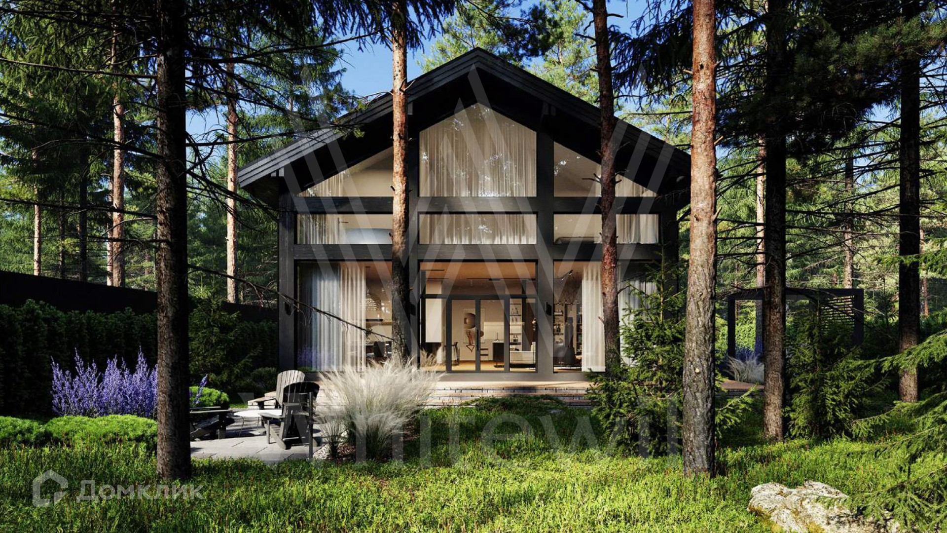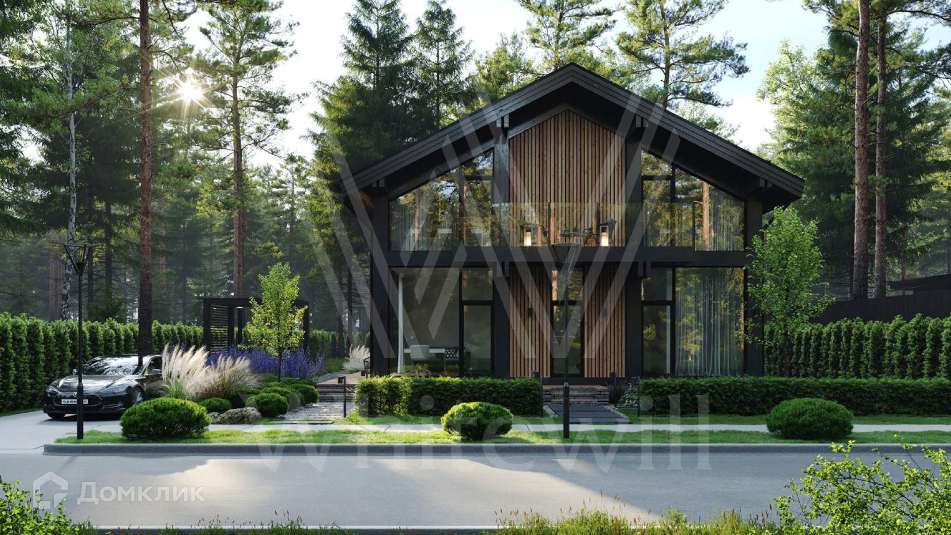 ID 11 951. Лесные зори. Загородный дом площадью 306 м² по проекту foster delight расположен на лесном участке 8,4 сотки. Современный фасад здания в стиле «фахверк» выполнен с железобетонным каркасом и стенами из кирпича. Благодаря панорамному остеклению и потолкам высотой 3,6 метра внутренее просторанство наполнено воздухом и светом. В коттедже выполнена отделка whitebox — осталось лишь выбрать финишные покрытия, мебель и текстиль. В резиденции спланировали 3 спальни, гостиную, кухню-столовую и кабинет. На участке выполнен ландшафтный дизайн и вымощены дорожки.