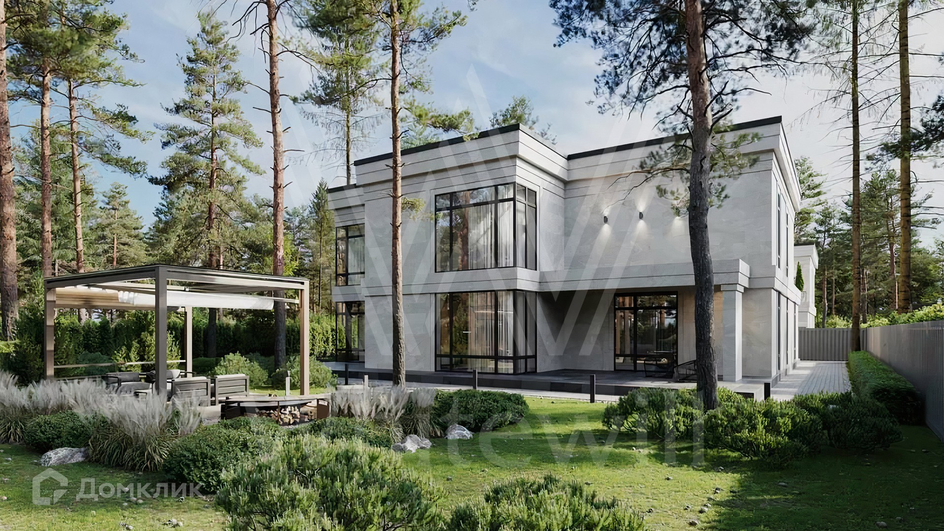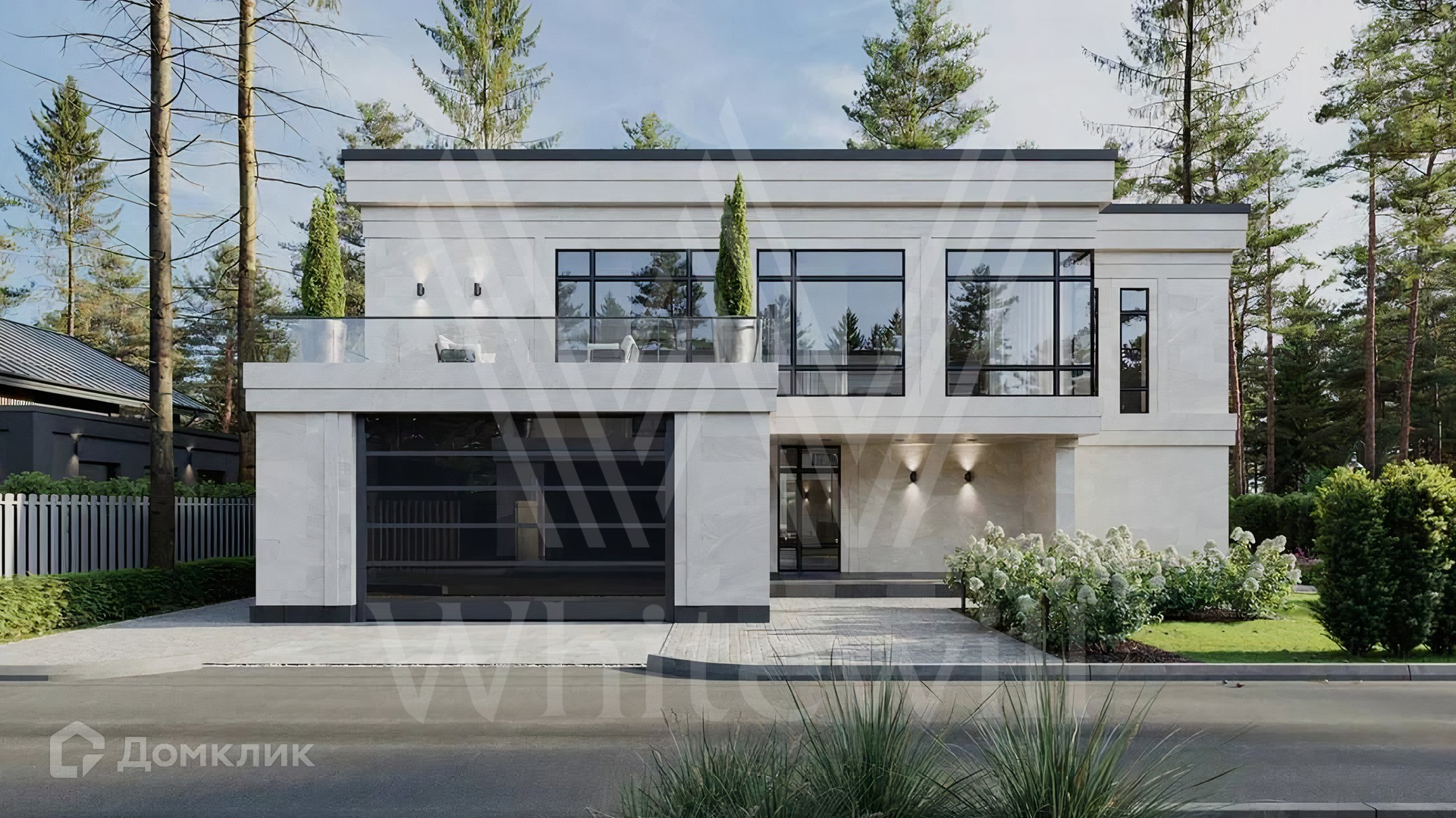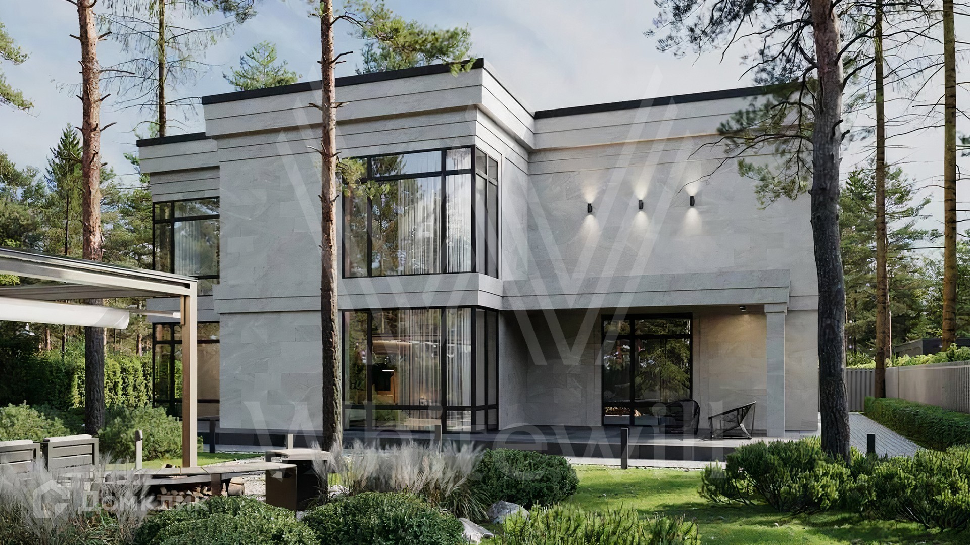 ID 11 963. Лесные зори. Загородный дом площадью 520 м² по проекту foster dream расположен на лесном участке 13 соток. Лаконичный фасад с панорамными окнами и плоской кровлей облицован натуральным камнем серых оттенков. В коттедже выполнена отделка whitebox — осталось лишь выбрать финишные покрытия, мебель и текстиль. В каждой спальне предусмотрен свой санузел, на втором этаже разместили просторную террасу. В конутре дома расположен гараж на 2 машины. На участке выполнен ландшафтный дизайн, вымощена площадка перед домом и высажены кустарники.