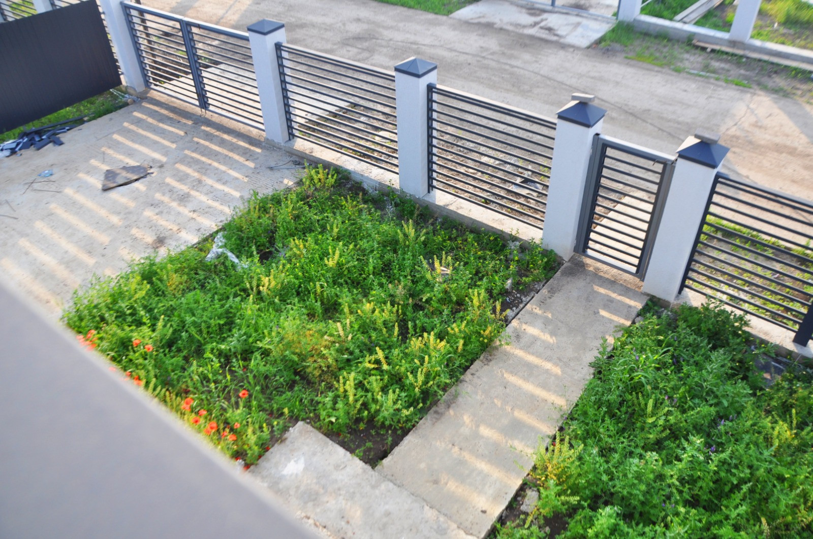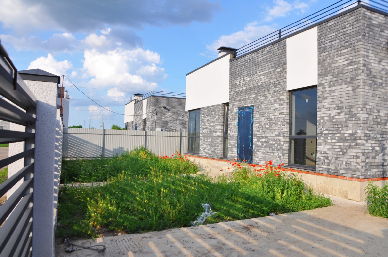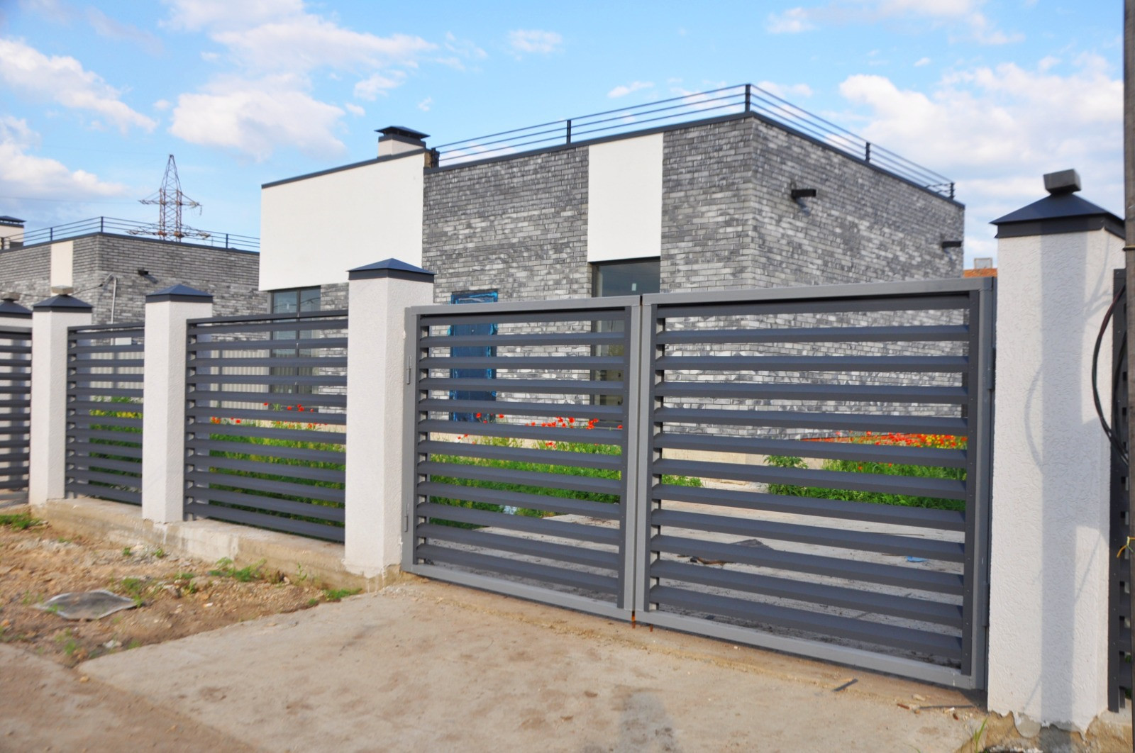 Фасадная часть забора 20 м, колонны с серыми ламелиями, боковое ограждение из профильного листа. Ворота, калитка, бетонированный заезд под машину.