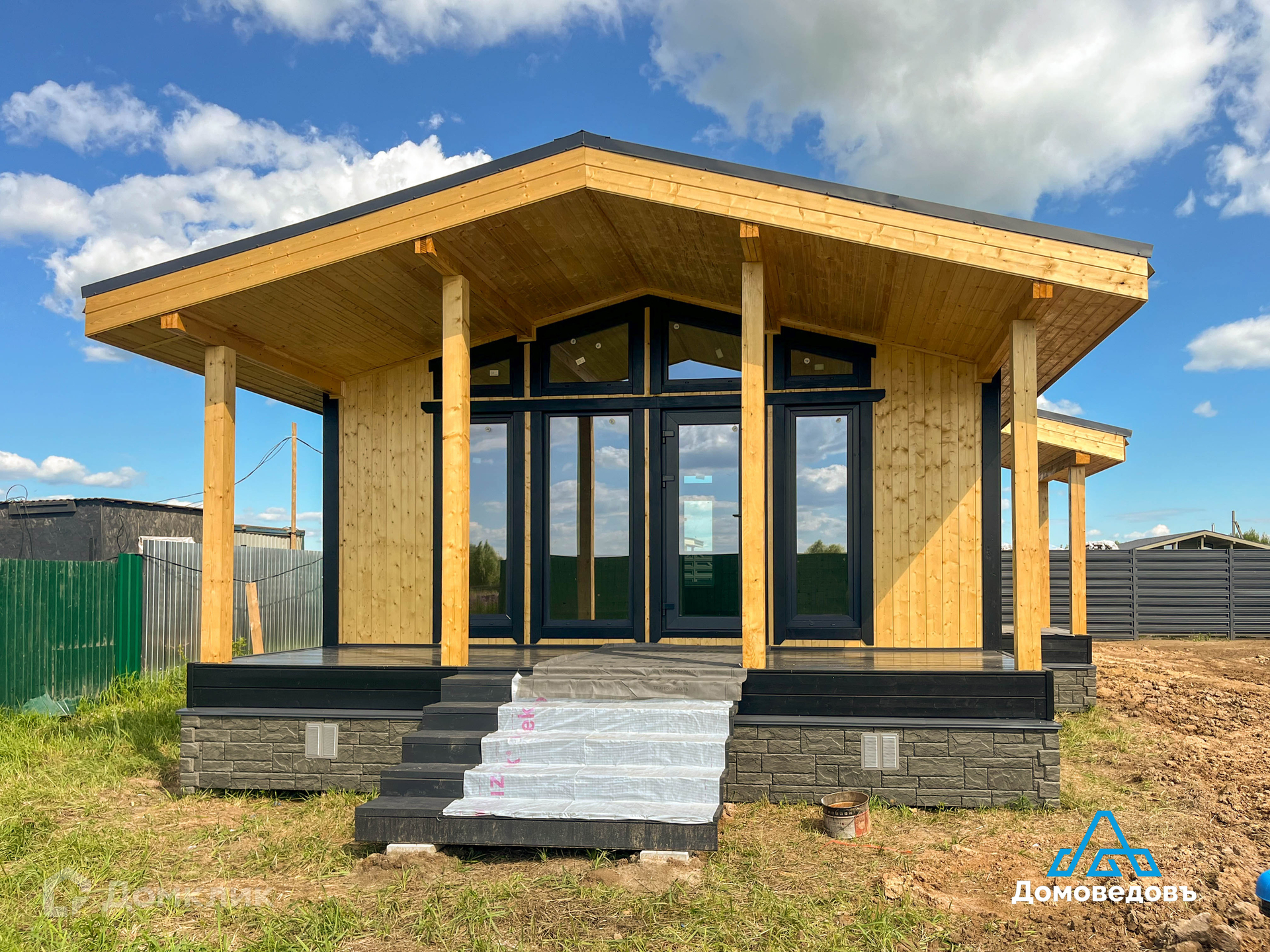 Дом построен по каркасной технологии с утеплением 150 мм (стены и перекрытия) и 200 мм (пол и потолок).