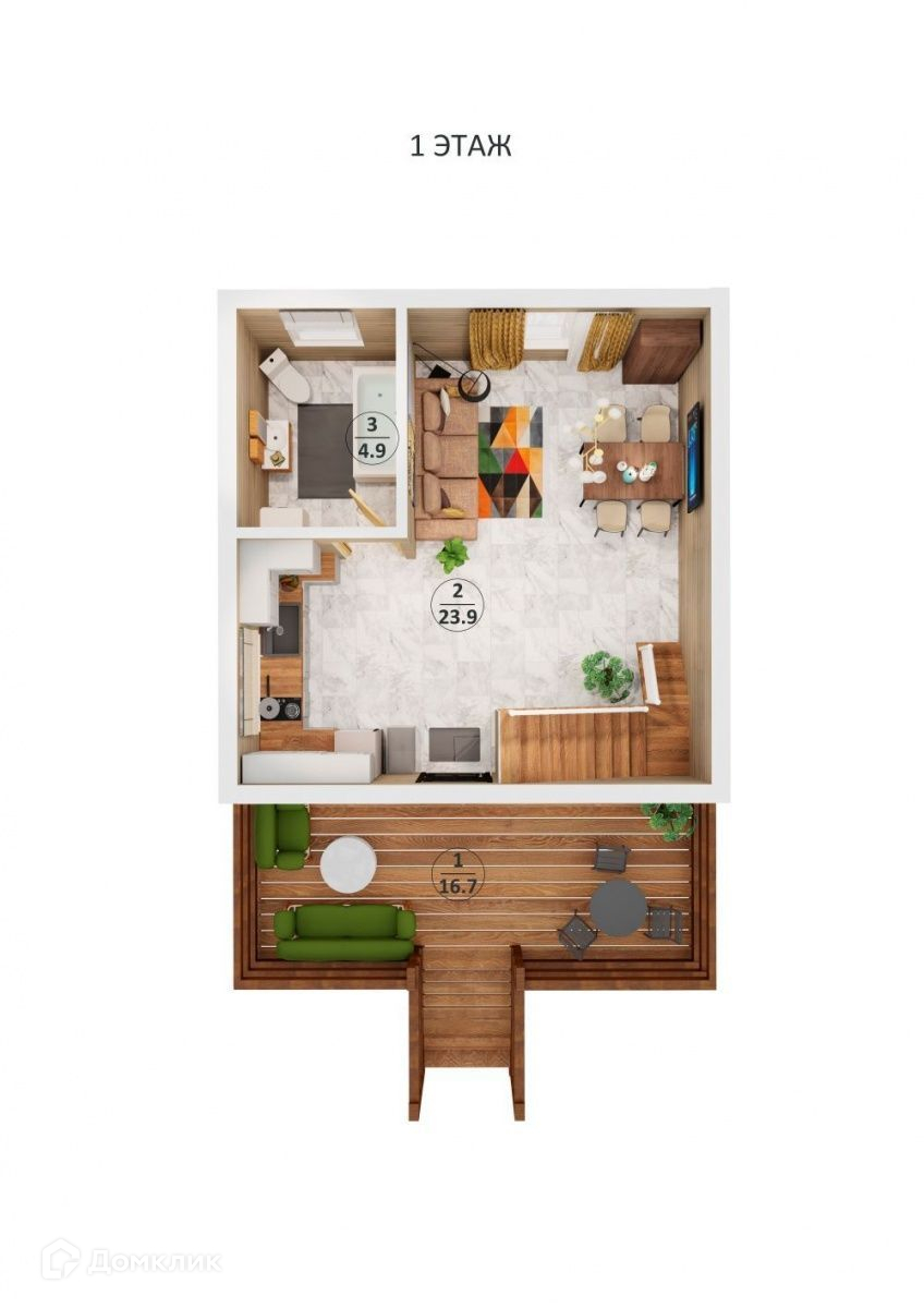 1 этаж: просторная комната, большая терраса,