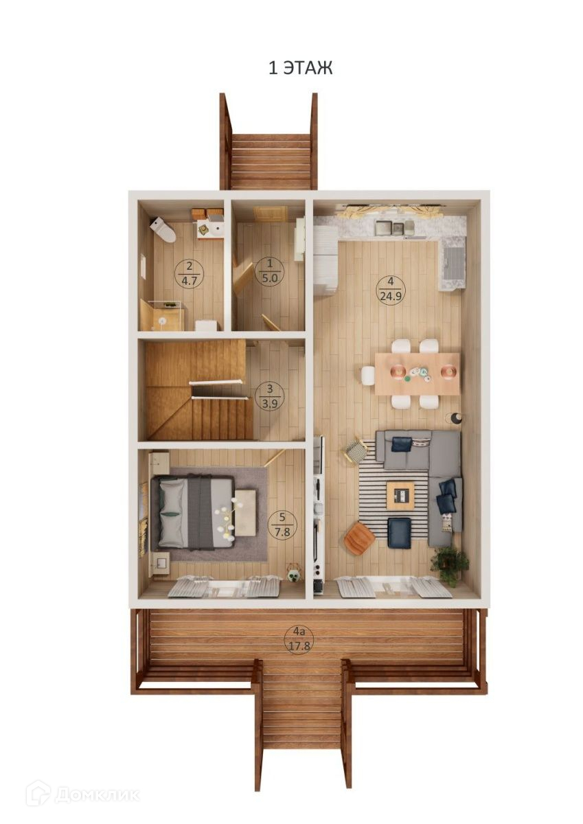 Первый этаж: прихожая, котельная, коридор, санузел, 1 спальная комната, кухня-гостиная, терраса.
