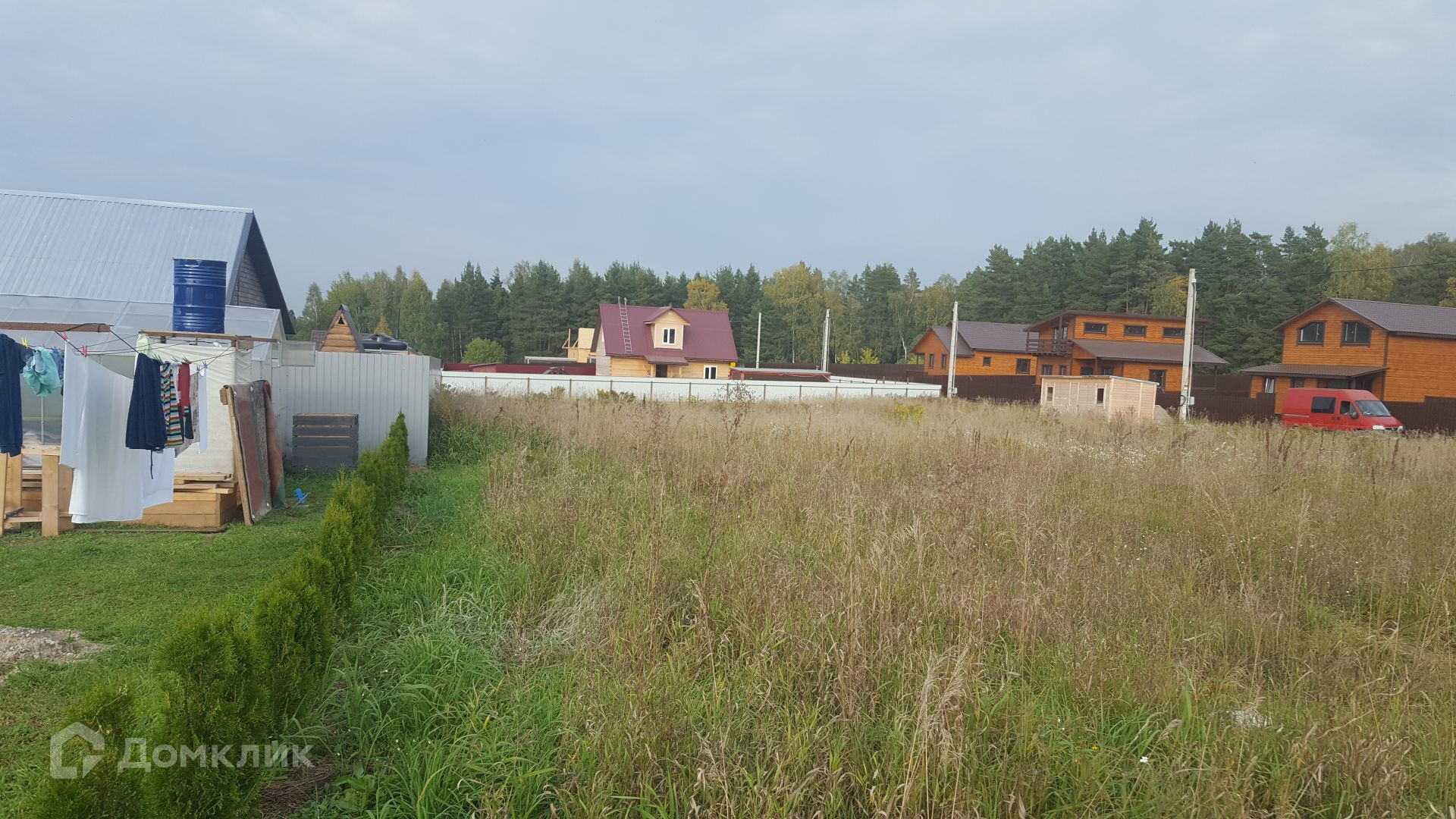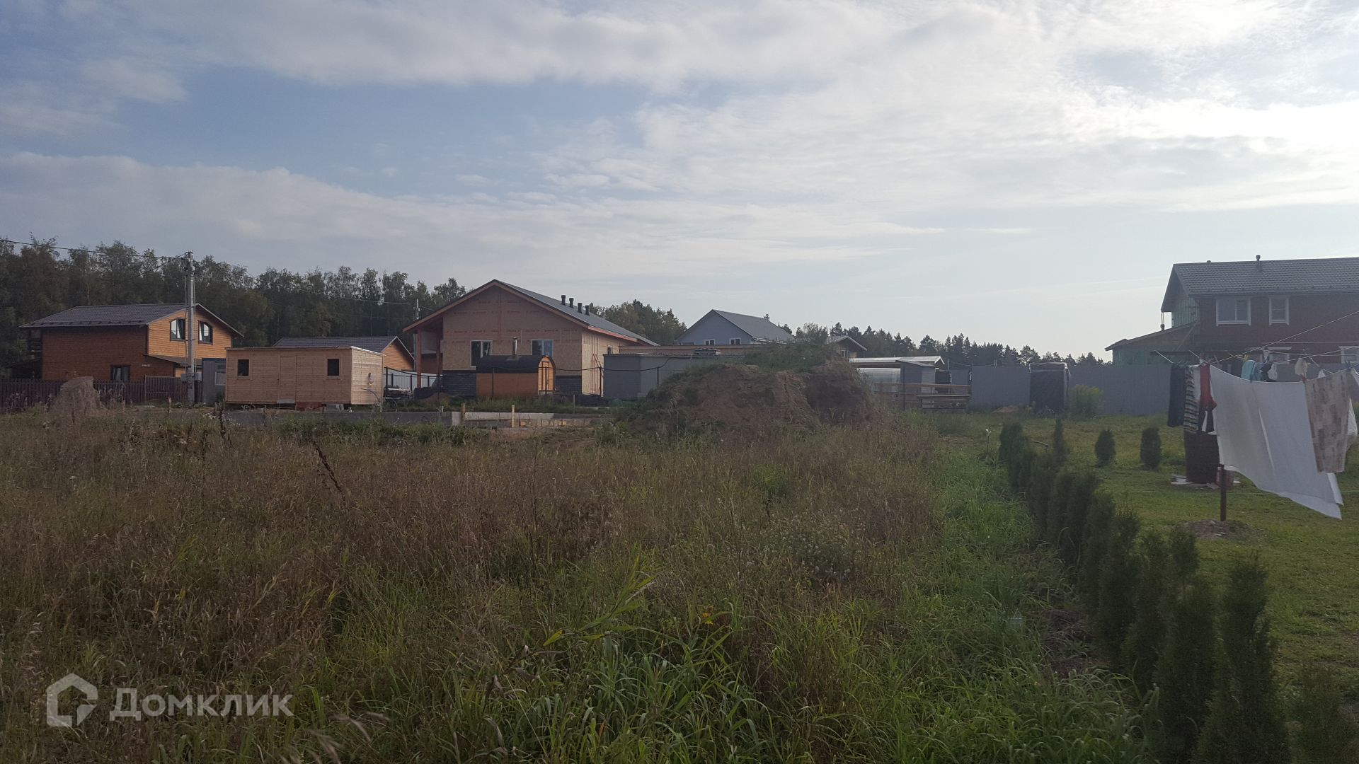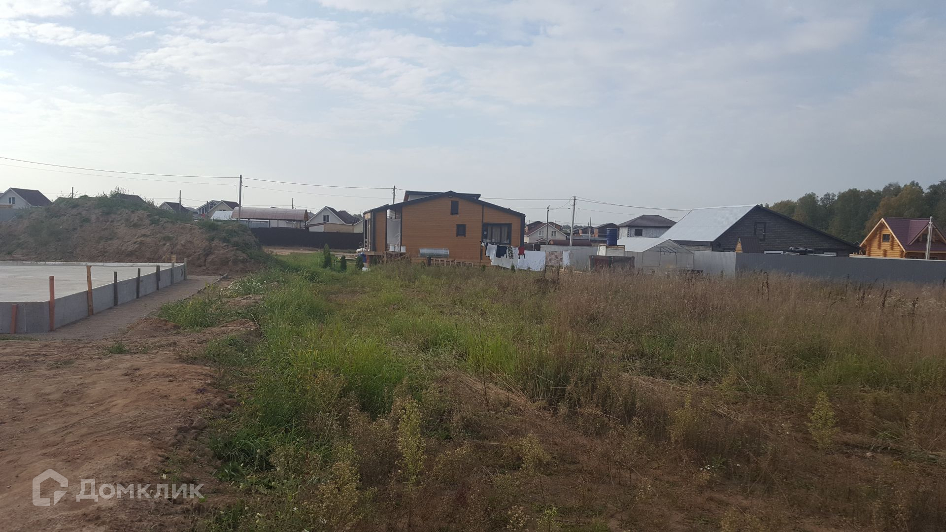 Участок ровный, сухой, с одной стороны соседи уже строят дом, сзади участка соседи уже живут.
