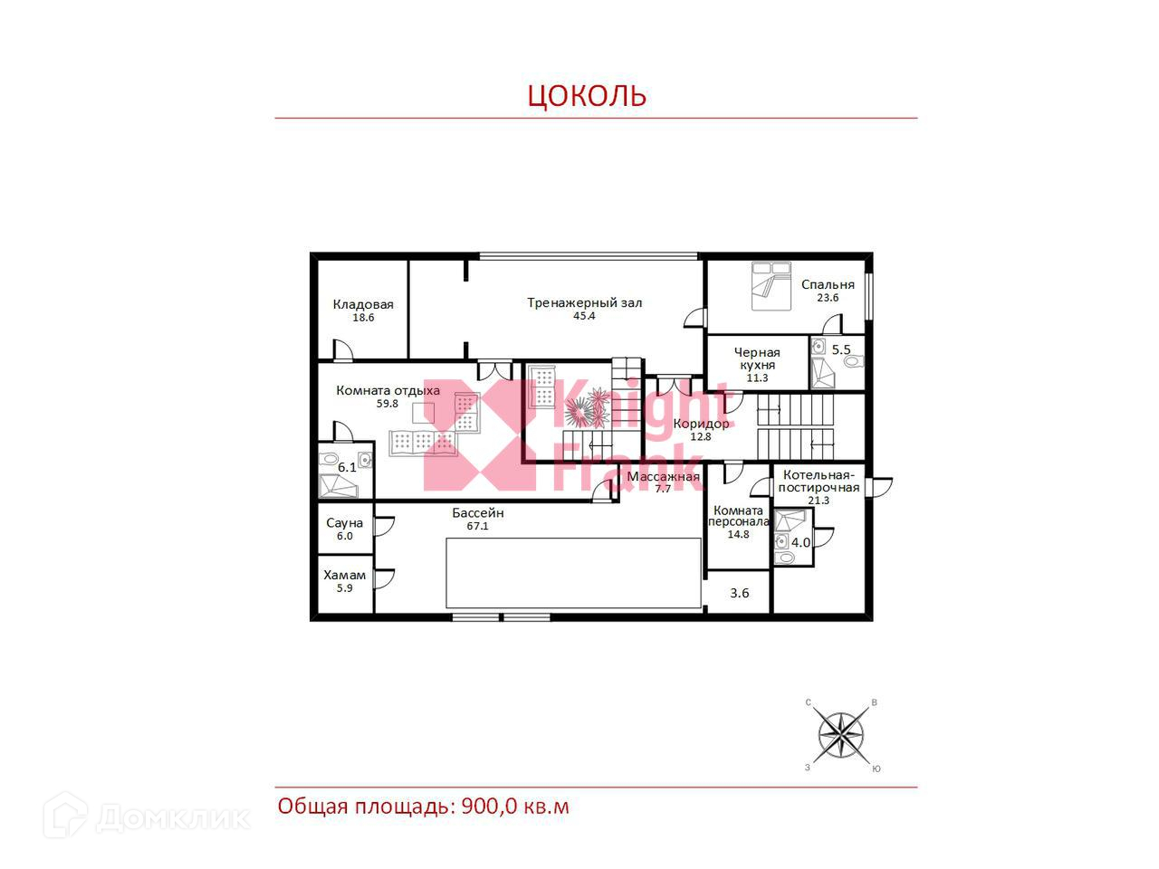 Цоколь: коридор, комната для персонала, котельная-постирочная, с/у, подсобное помещение, массажная, бассейн, хаммам, сауна, лестница, комната отдыха, с/у, кладовая, тренажерный зал, спальня с с/у, рабочая кухня;