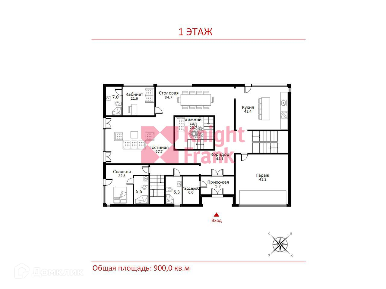 1 этаж: прихожая, гардеробная, с/у, гостиная, кухня, столовая, кабинет, спальня с с/у, зимний сад, терраса, гараж на 2 м/м;