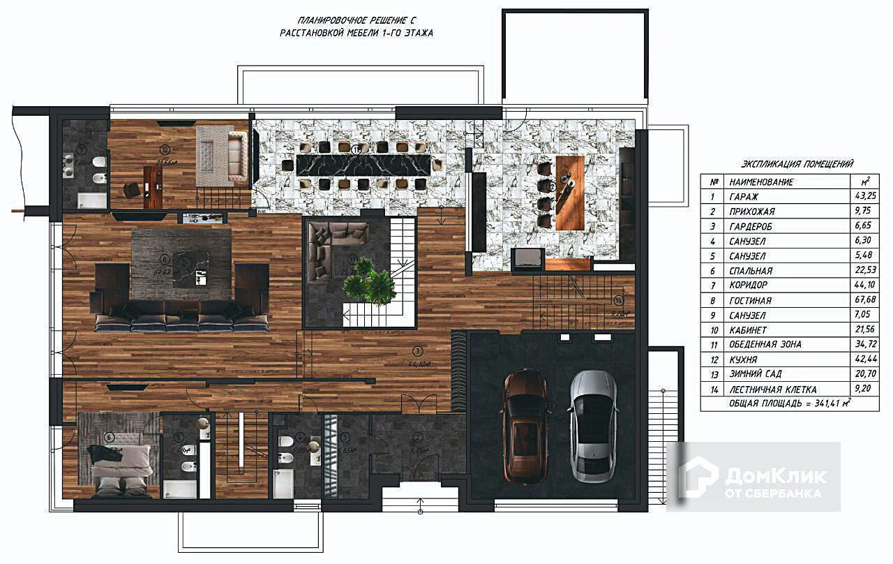 1-ый уровень: Обеденная зона, кухня, зимний сад, кабинет, спальня, два с/у, гардеробная, гараж 2 м/м.
