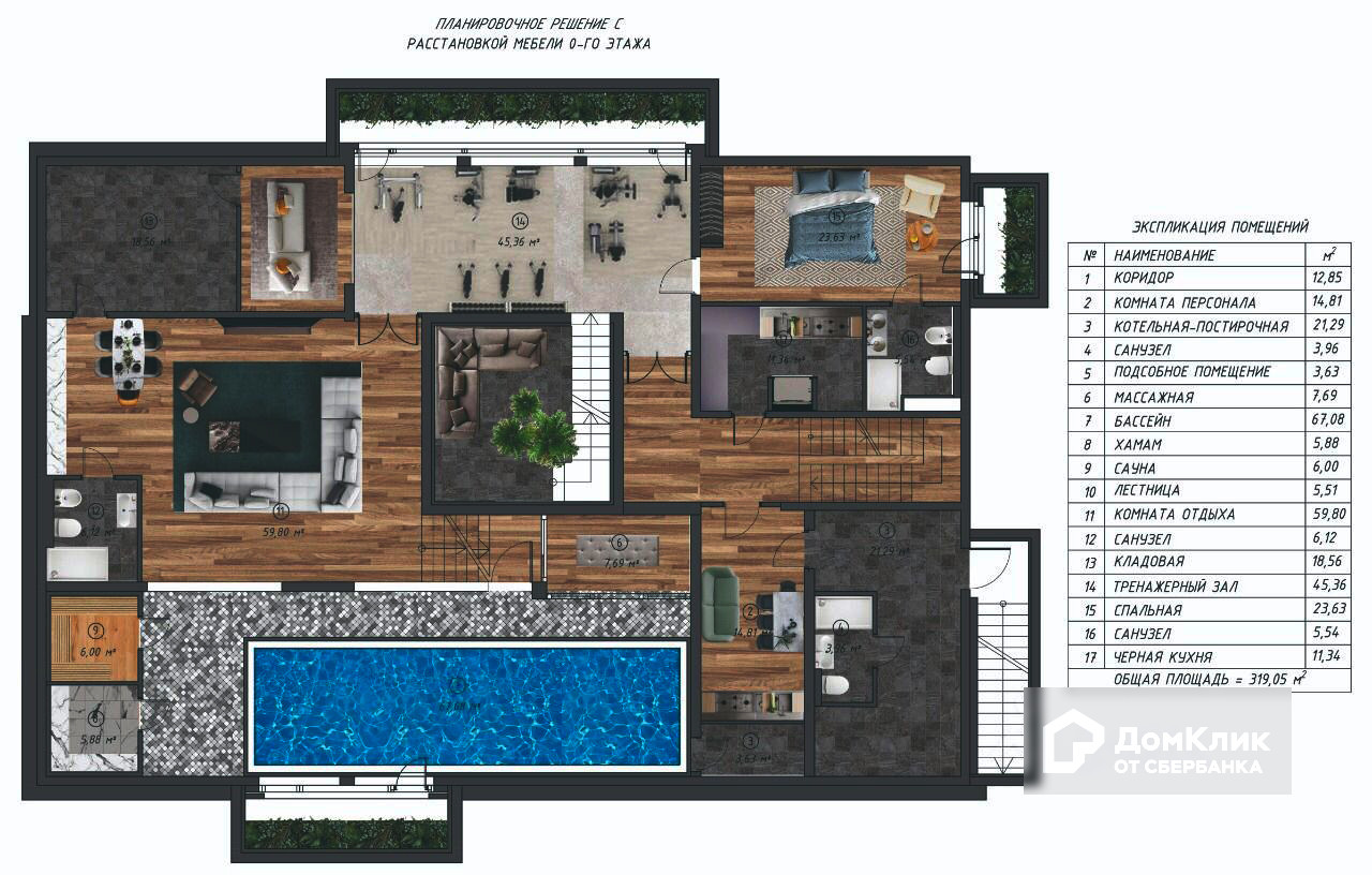 Цоколь: СПА зона (бассейн, хамам, сауна, массажная), комната отдыха, тренажерный зал, спальня, с/у, черная кухня, помещение для персонала, котельная-постирочная.