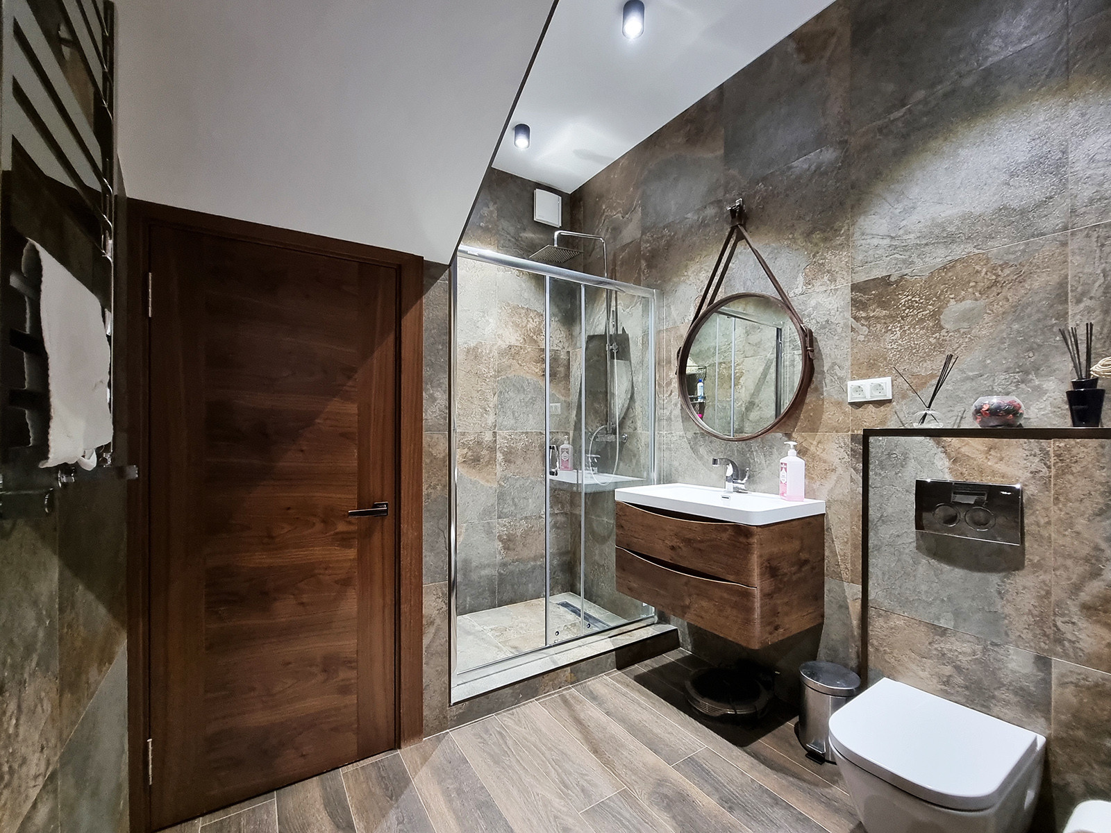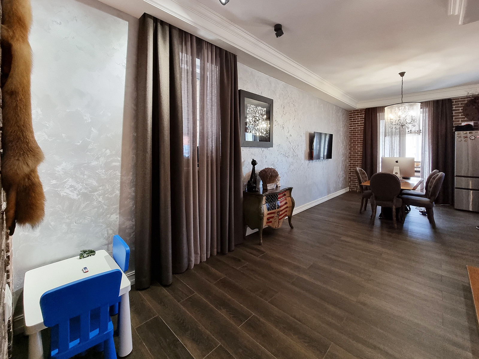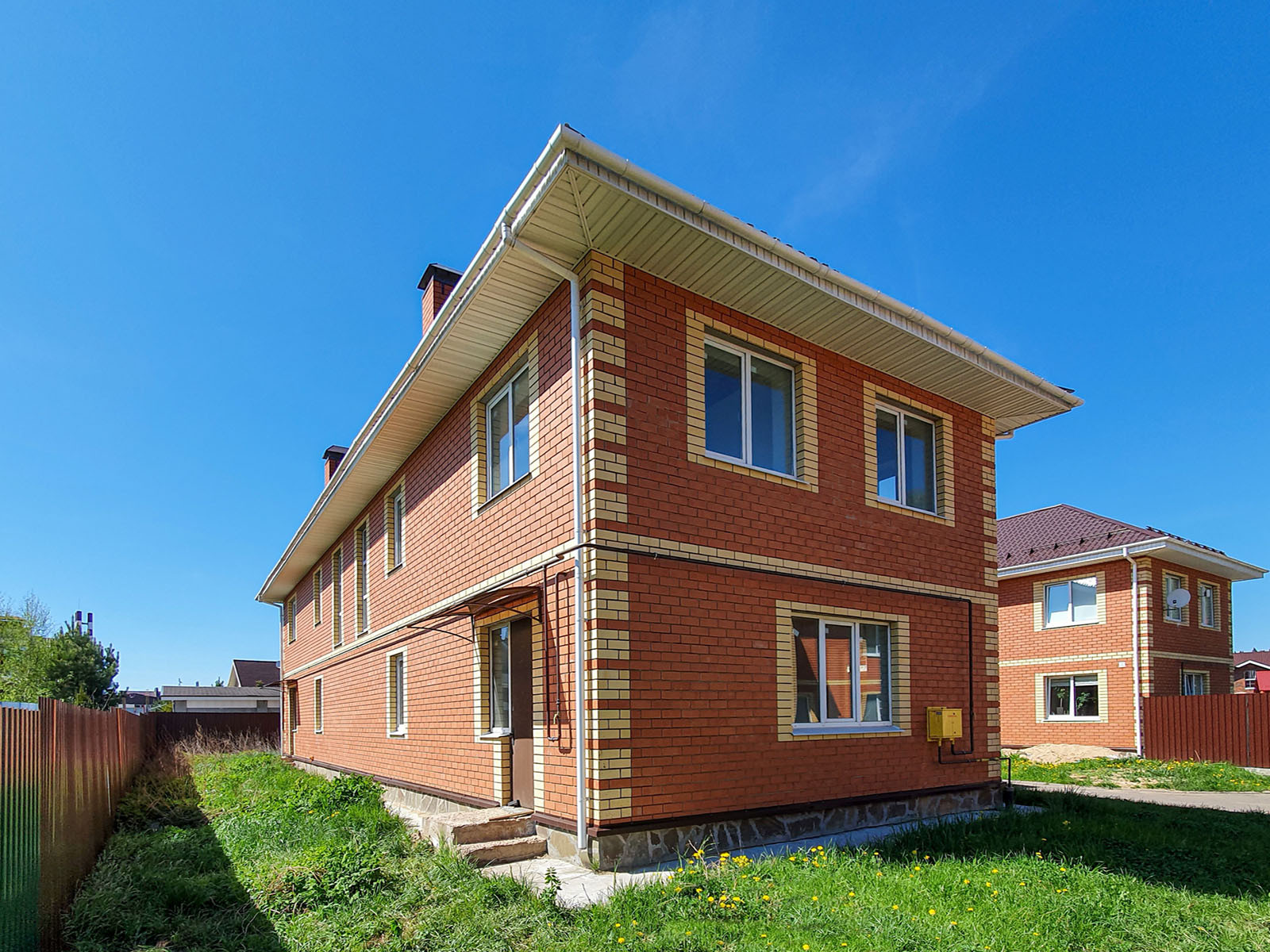 Двухэтажный готовый дуплекс с отделкой «под ключ» имеет площадь 123,9 м². Несущие стены выполнены из кирпича, фасад облицован кирпичом.