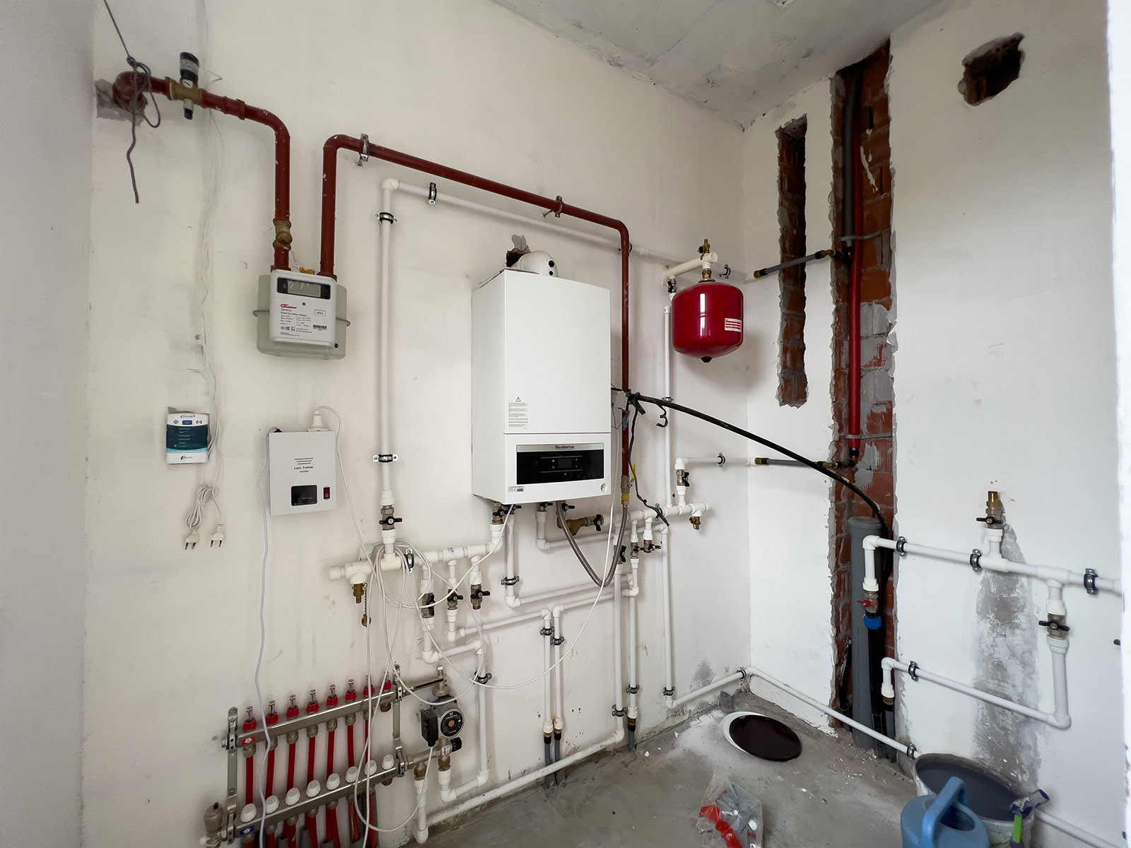 - водопровод (водоснабжение поселка предусматривает артезианские скважины), канализация, газ магистральный (установка газового котла Budetus мощностью 24 кВт), электричество.