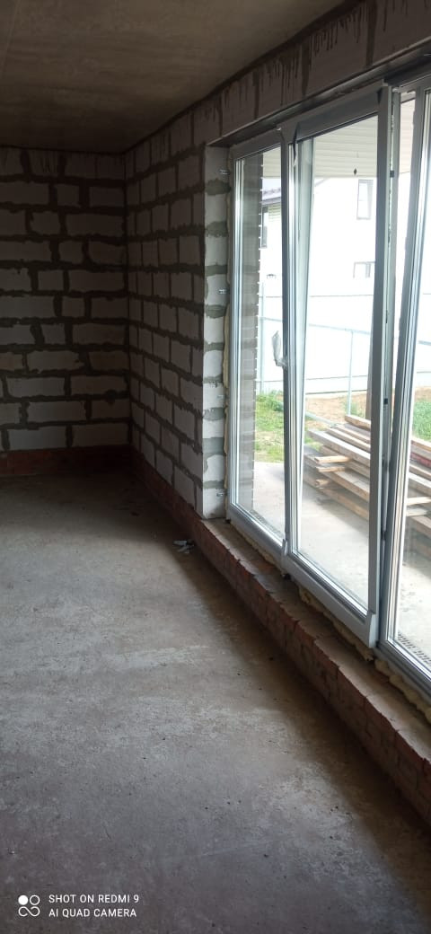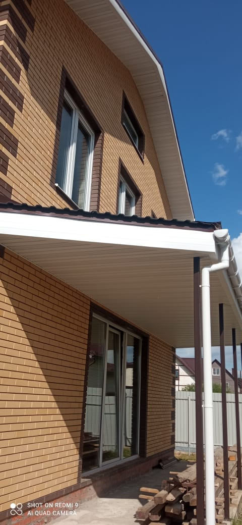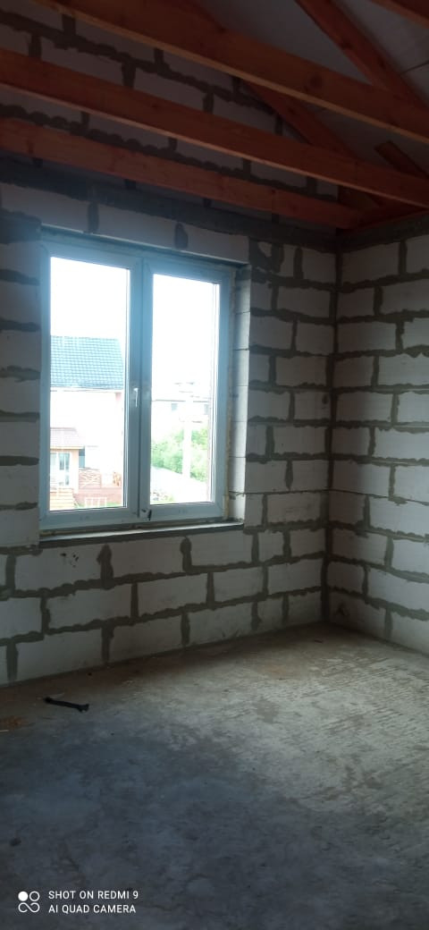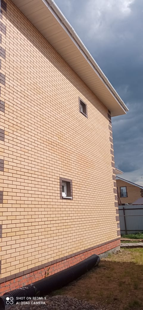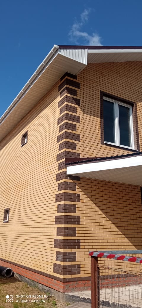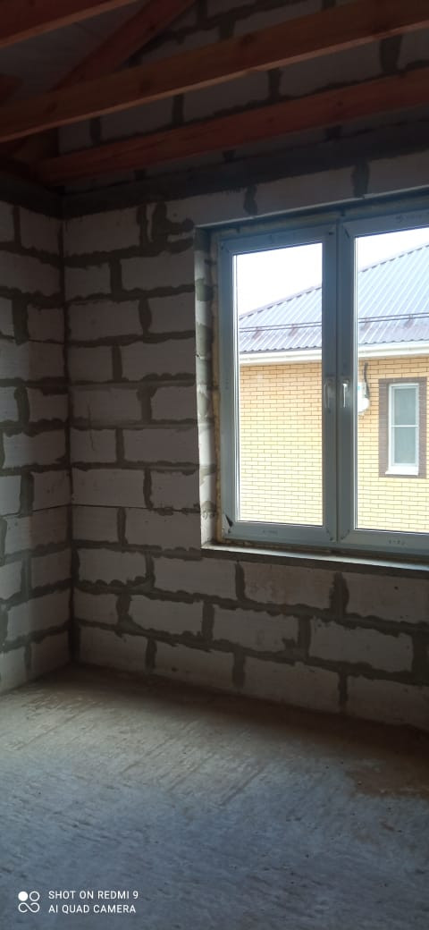 Фундамент: армированная единая плита 400 мм, стены: облицовочный кирпич, утеплитель, пеноблоки, крыша профлист, окна двухкамерный стеклопакет рехау 70.