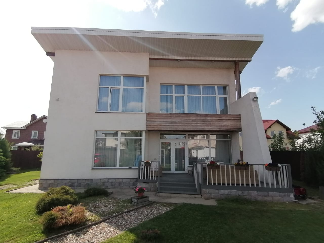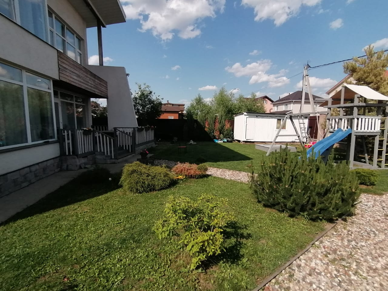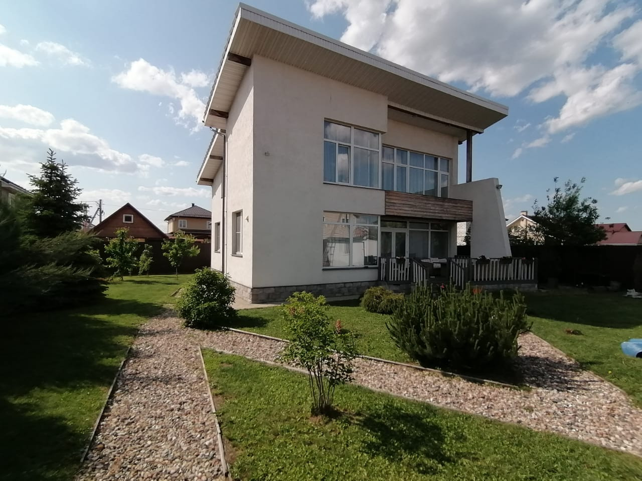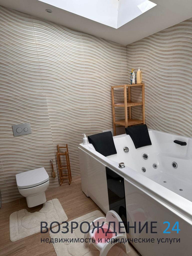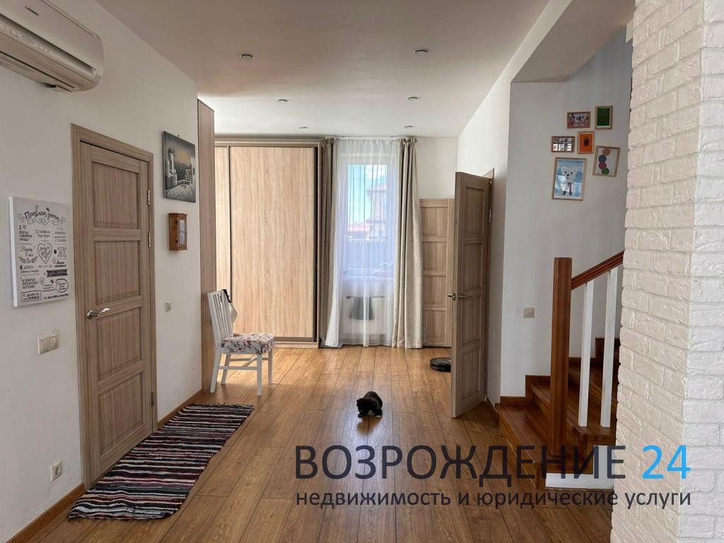 - Дом построен в 2015 году и находится в центре посёлка вдали от шума трассы. Очень тёплый зимой и прохладный в жару. Все коммуникации центральные, в доме газ, электричество (15 кВт), вода, интернет и ТВ, возможна прописка. На первом этаже по всему полу проложен теплый пол, находится холл, туалет, постирочная, бойлерная и кухня-гостиная в одном пространстве. На втором этаже: холл, 3 спальни, гардеробная, две ванные комнаты. По вашему желанию оставим всю бытовую технику и мебель. Участок ровный, с ухоженным газоном и цветочными клумбами, стоит бытовка и есть детская горка с качелями и песочницей, высажены туи, ели и плодовые деревья (яблони, черешни и груши). Стоянка на 2 машины с подъемными воротами.