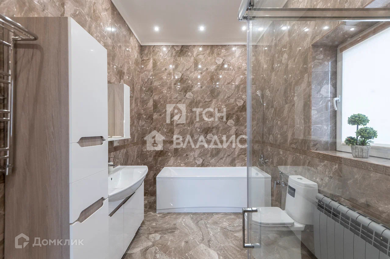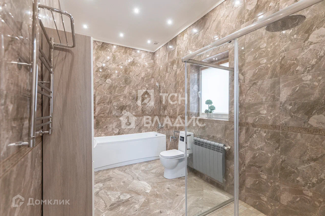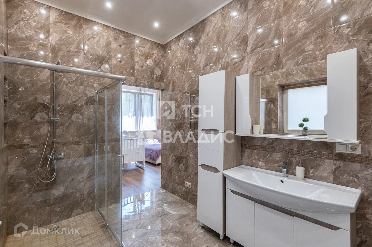 Дом построен из газоблока, снаружи облицован натуральным камнем. Панорамное остекление. Крыша покрыта металлочерепицей. В доме выполнен качественный ремонт. Теплый пол.