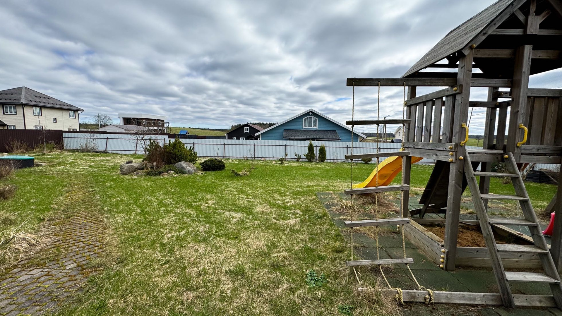 Дорожки мощеные, есть площадка для бассейна или мангальной зоны.