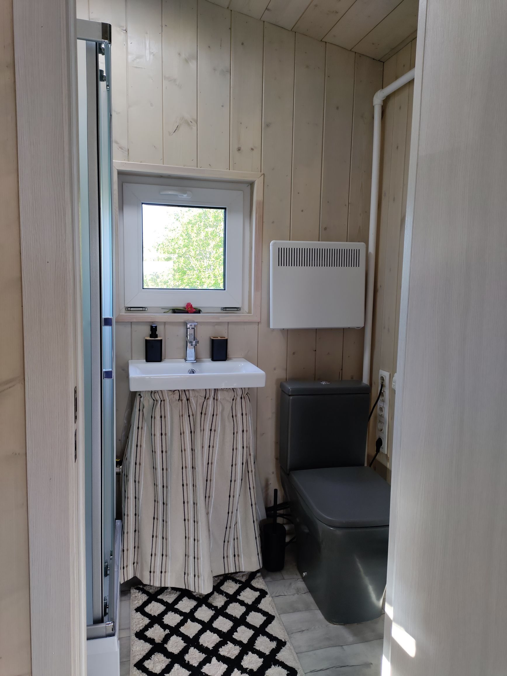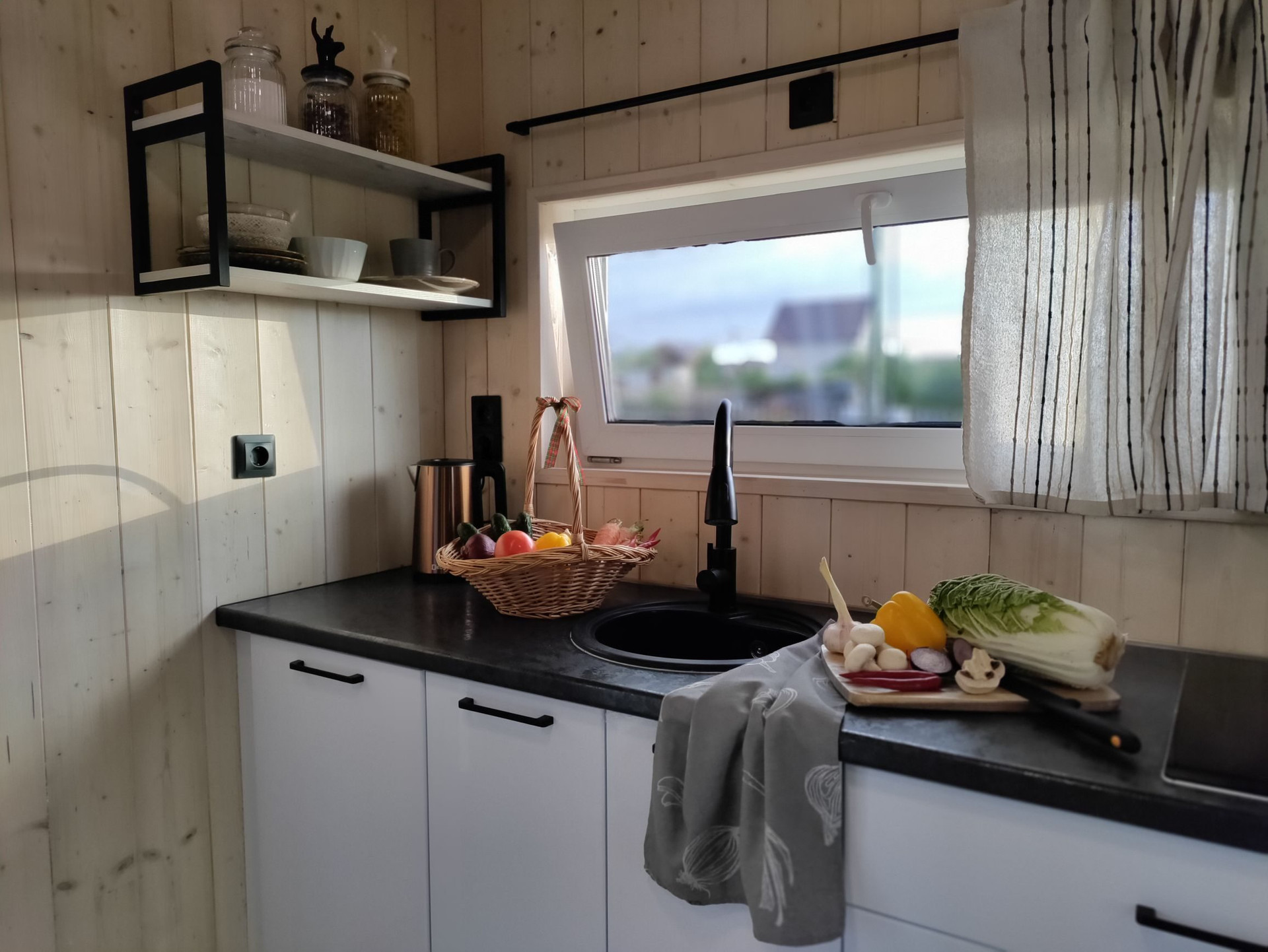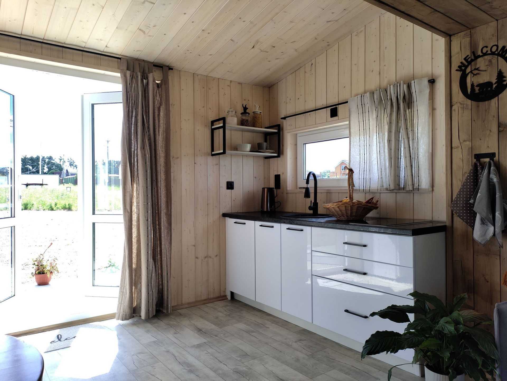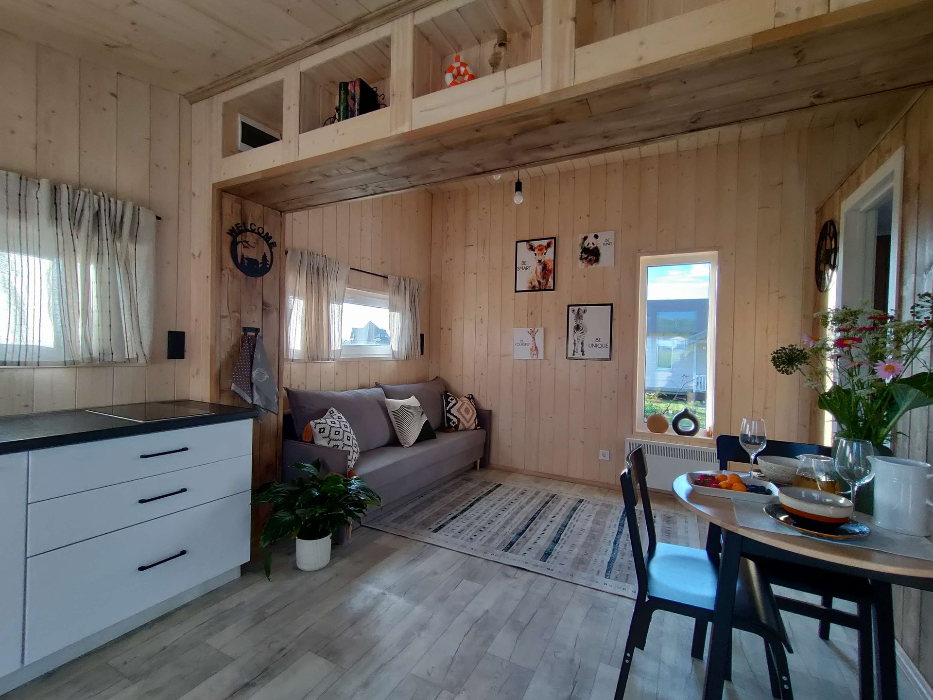 Дом при компактных размерах идеально спланирован и вмещает в себя изолированную спальню, просторную кухню-гостиную с высокими потолками до 3,2 метра, тамбур, санузел с душевой кабиной и просторную антресоль, на которой можно расположить дополнительные спальные места или систему хранения. Из гостиной, распахнув панорамные окна, вы попадаете на 15 метровую террасу, с которой открываются потрясающие виды на рассветы и закаты. Дом рассчитан на проживание 4 персон, при желании, в доме можно комфортно разместить до 6 человек!