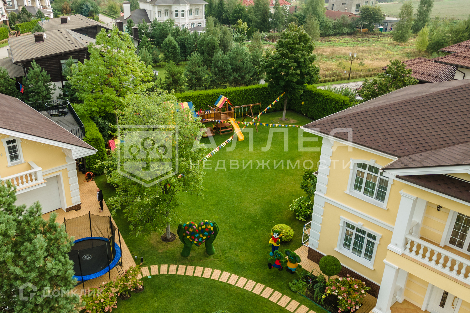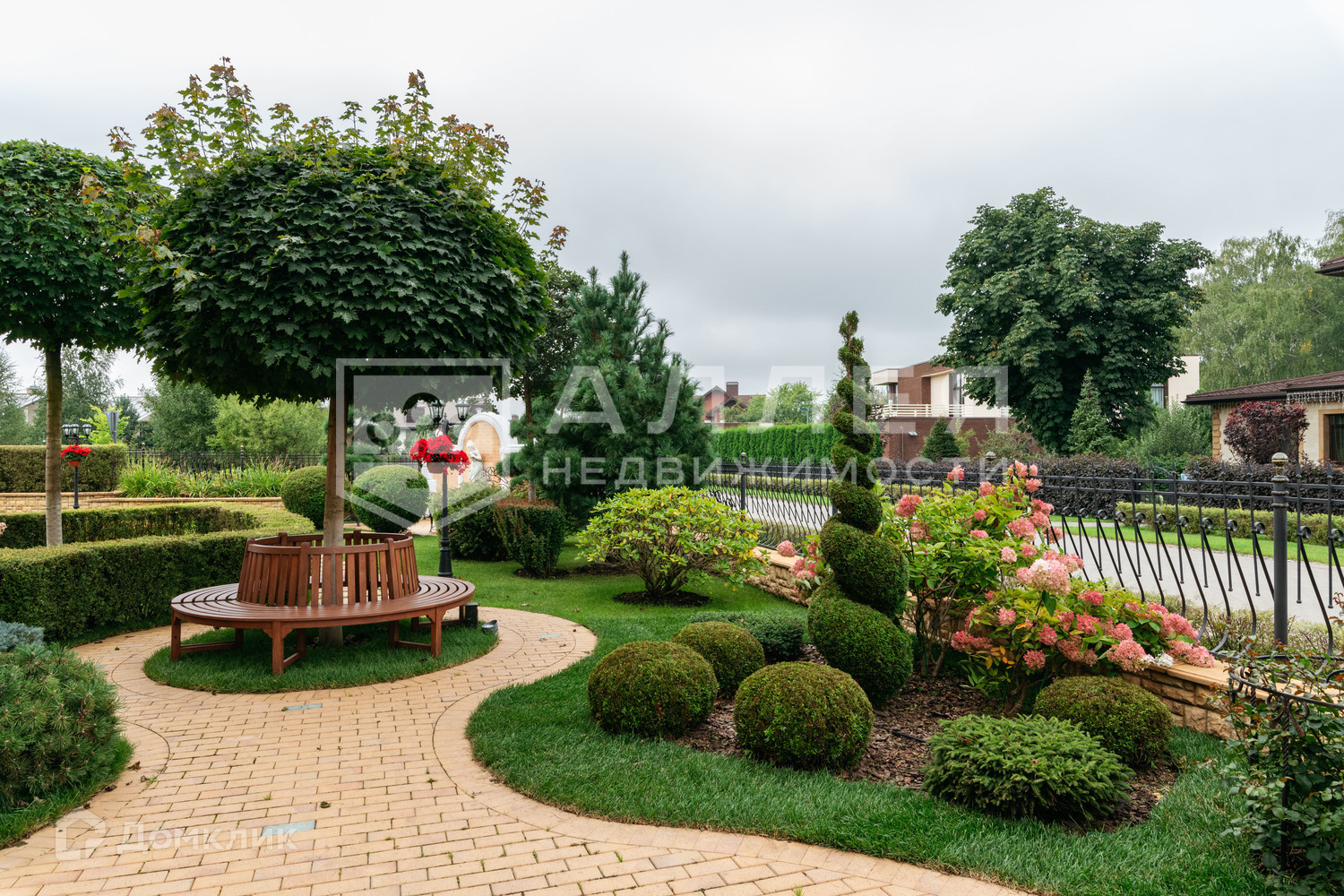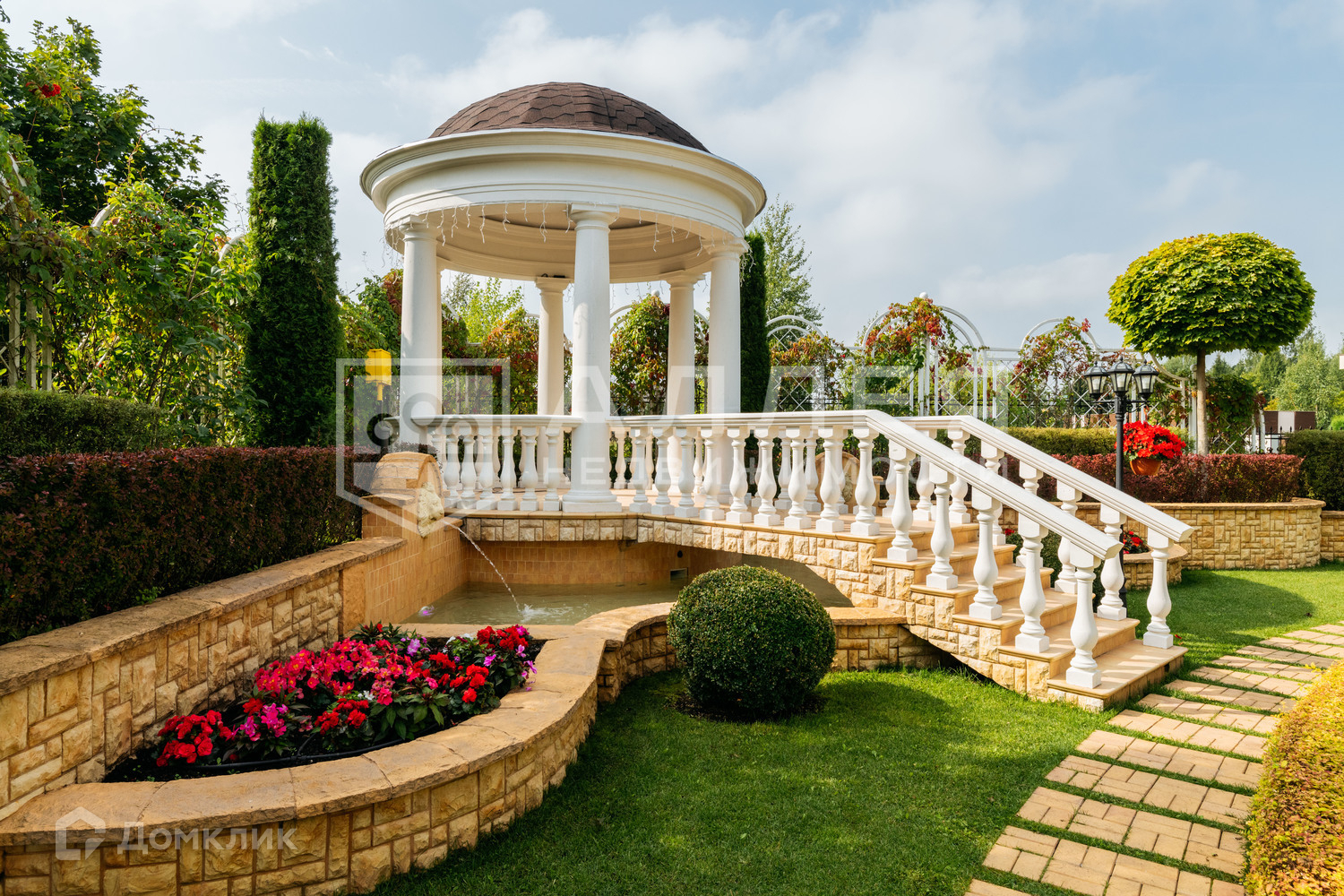 1. Парковая зона с ландшафтным дизайном: выстриженные кустарники, цветы, декоративные и плодово-ягодные деревья, фонтаны, ротонда с фонтаном, лавочки и дорожки из брусчатки. Крыльцо и дорожки подогреваются в зимнее время.