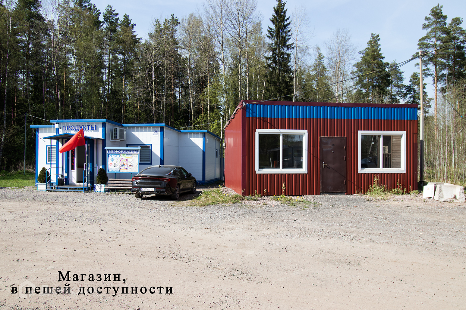 При въезде в поселок организовано КПП со шлагбаумом, есть магазин.
