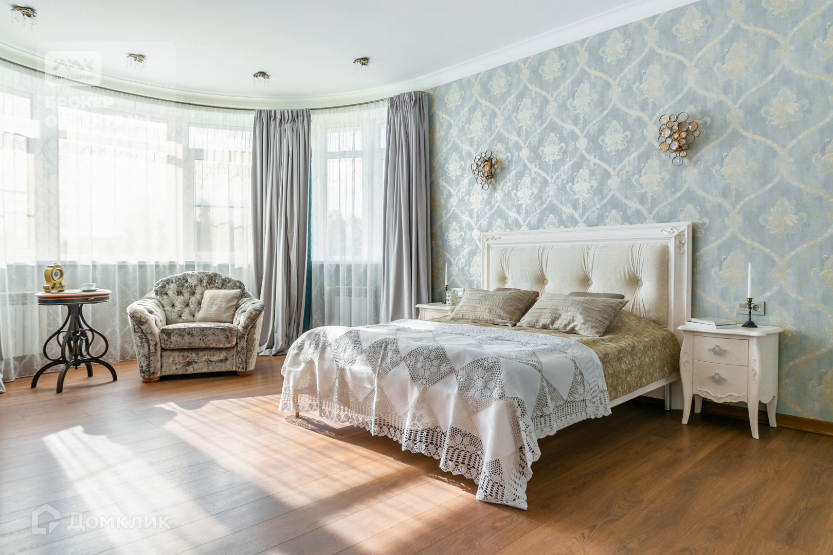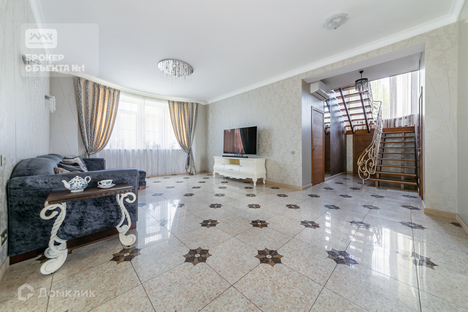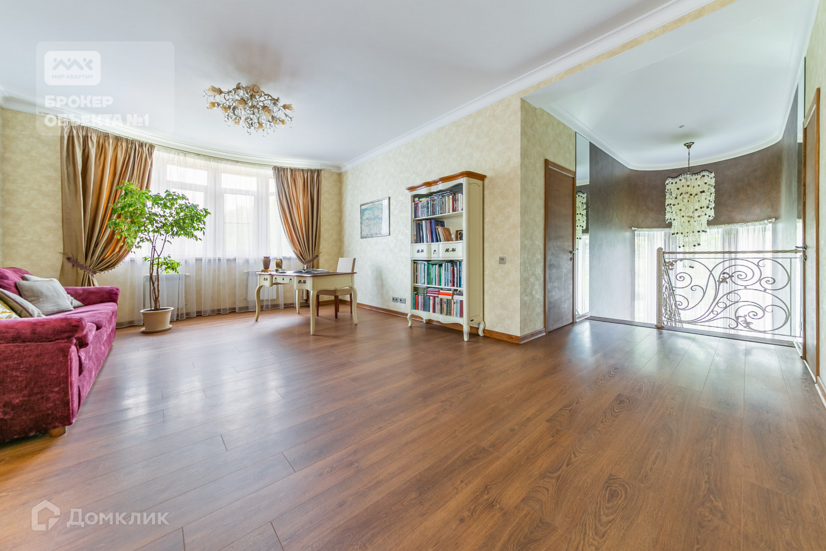 Дубовая лестница с кованными перилами, авторские обои, шелковые портьеры, дизайнерские люстры - все детали продуманы и выполнены с любовью.
