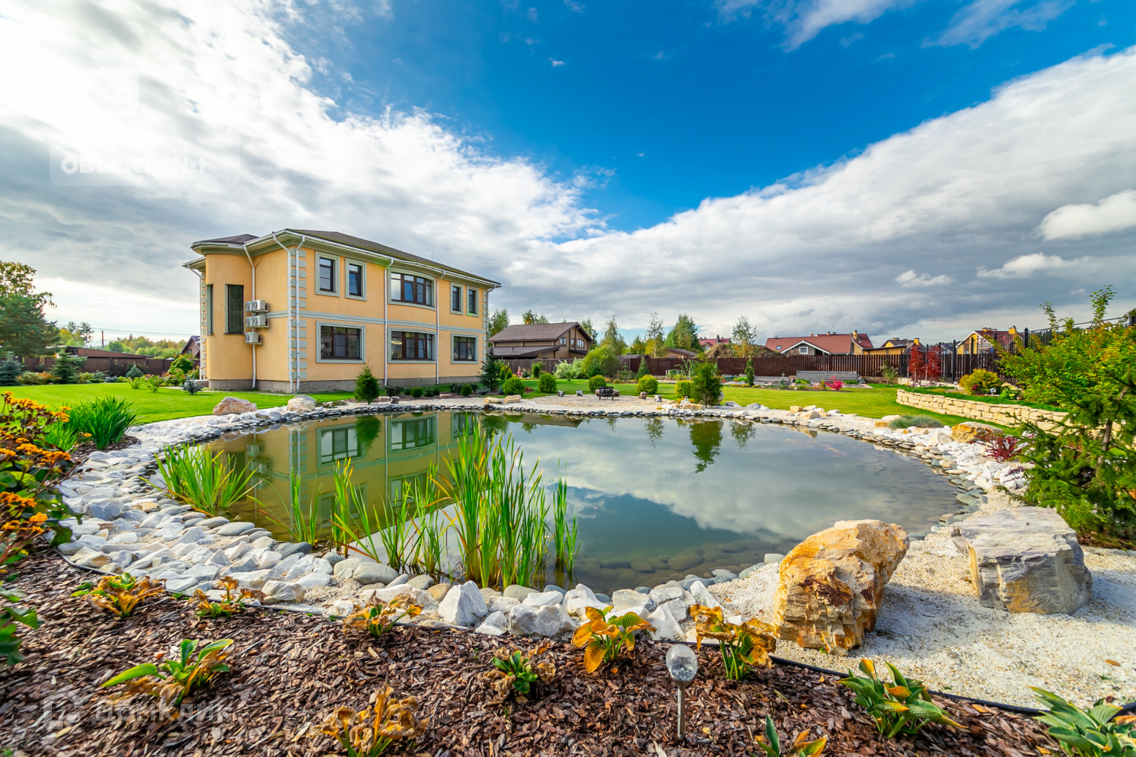 Безусловным преимуществом расположения дома, является его непосредственное соседство с лесом и участком 28 соток с собственным прудом, в которым плавают рыбки!