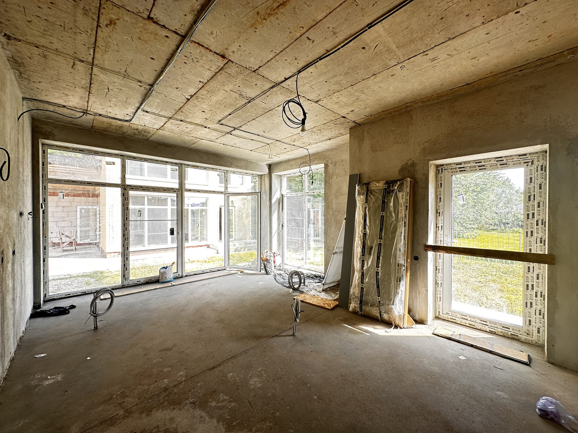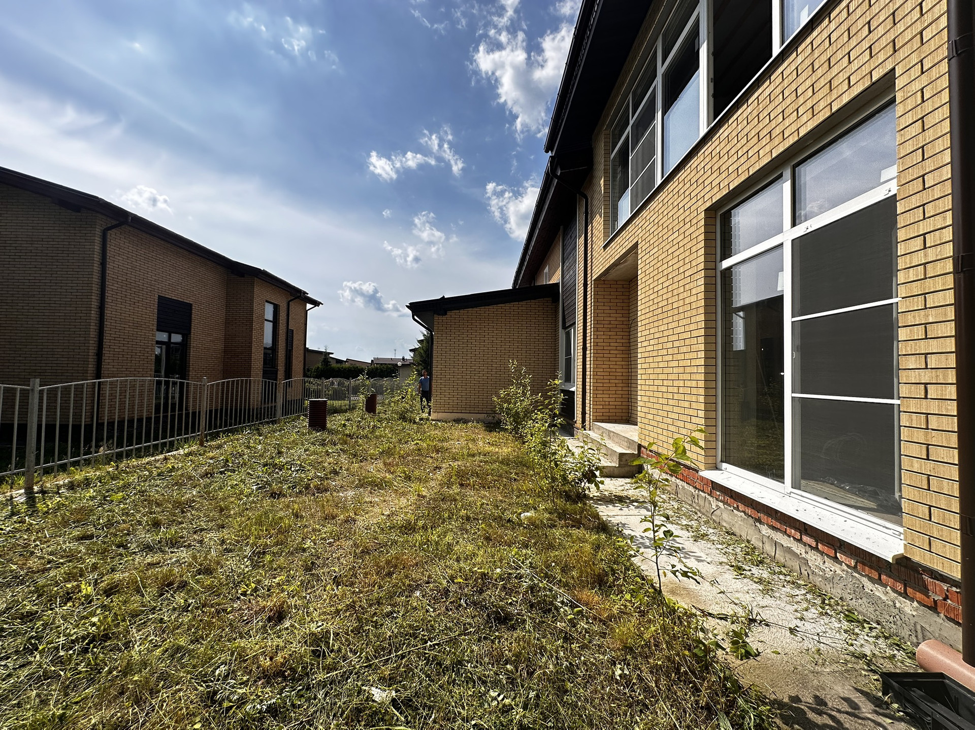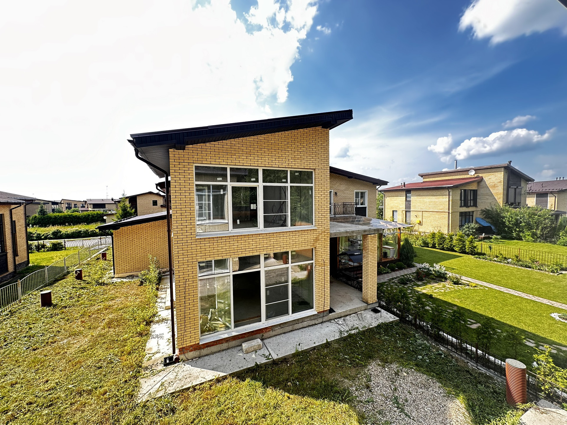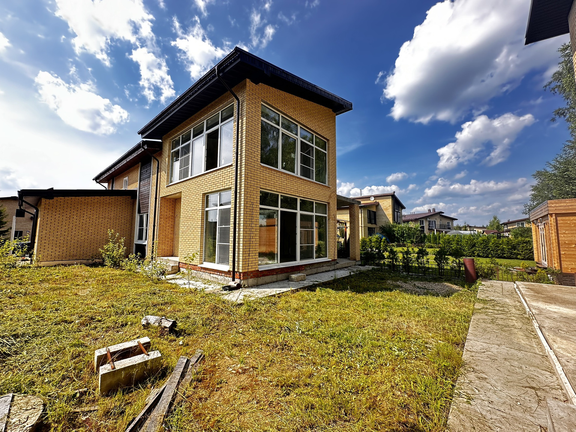 - Большие окна в пол, современные фасады.