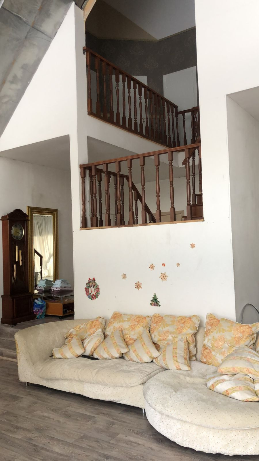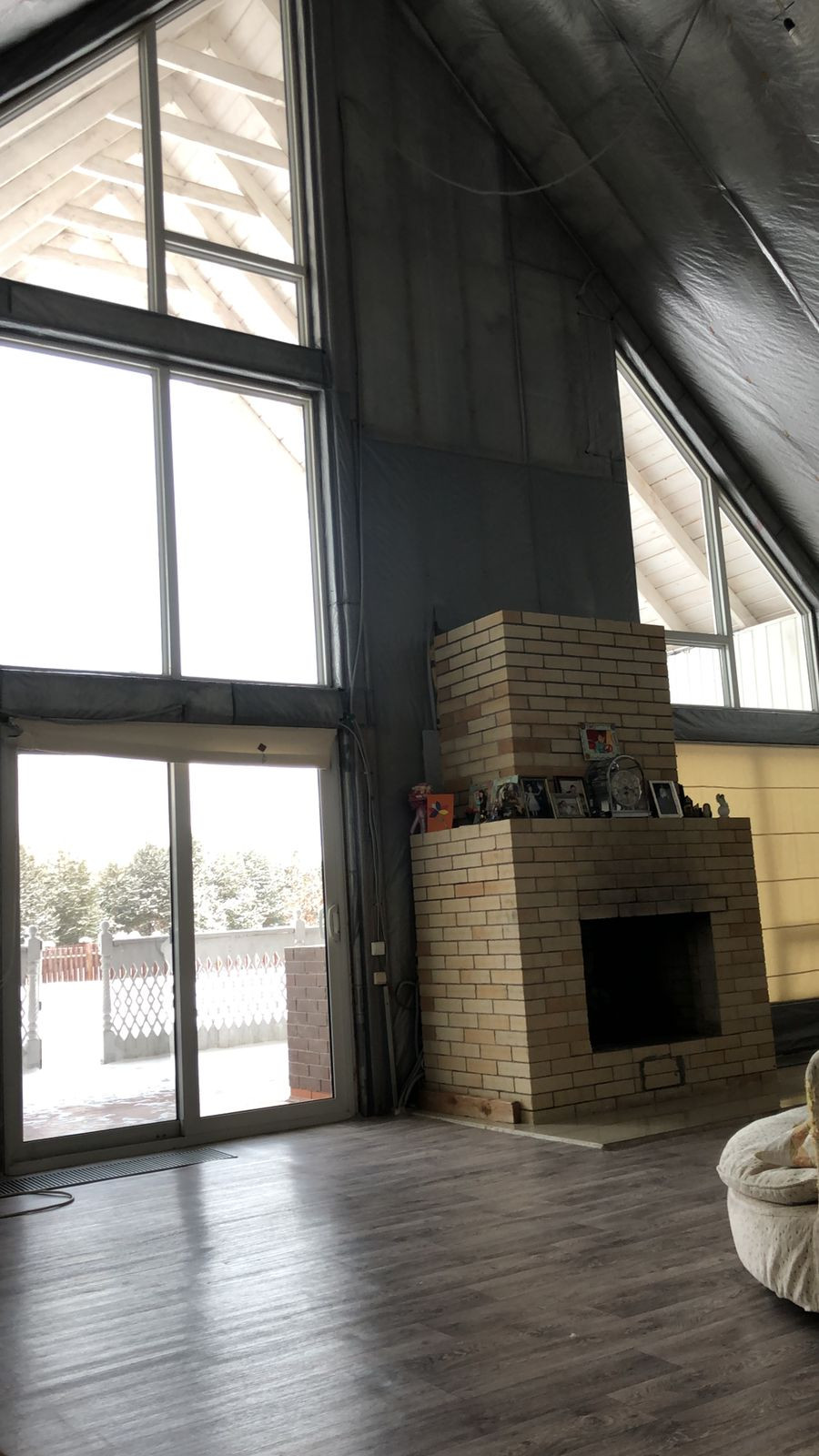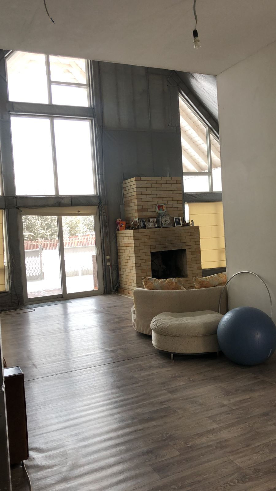 на 1ом этаже Витражные окна выход на барбекю свободное место и прекрасное для отдыха. Дом не достроен внутри до конца. есть свободные площади на 1ом этаже по своему усмотрению можно доделать комнатами.,баней, гаражом и тд. Можно в доме сделать и второй вход если нужно. всё для этого есть: 1ый Этаж ( Гостинная большая, столовая, санузел с душевой, 2-комнаты,огромная гардеробная, выход в гараж.