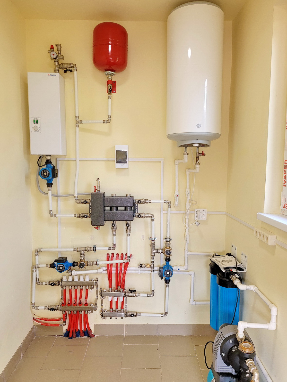 На первом этаже - супер комфортное водяное отопление пола, пол - керамогранит;
