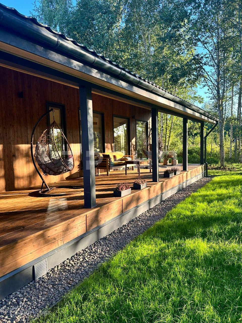 В доме 3 спальни, 2 санузла, панорамные окна, большая кухня-гостиная, сауна, просторная терраса. На террасе установлена купель Фурако с печкой. Площадь дома - 106м2 + терраса 30м2.В доме 3 спальни и 2 санузла.В доме полноценный водяной тёплый пол. Утепление - эковата, качественный, долговечный утеплитель.