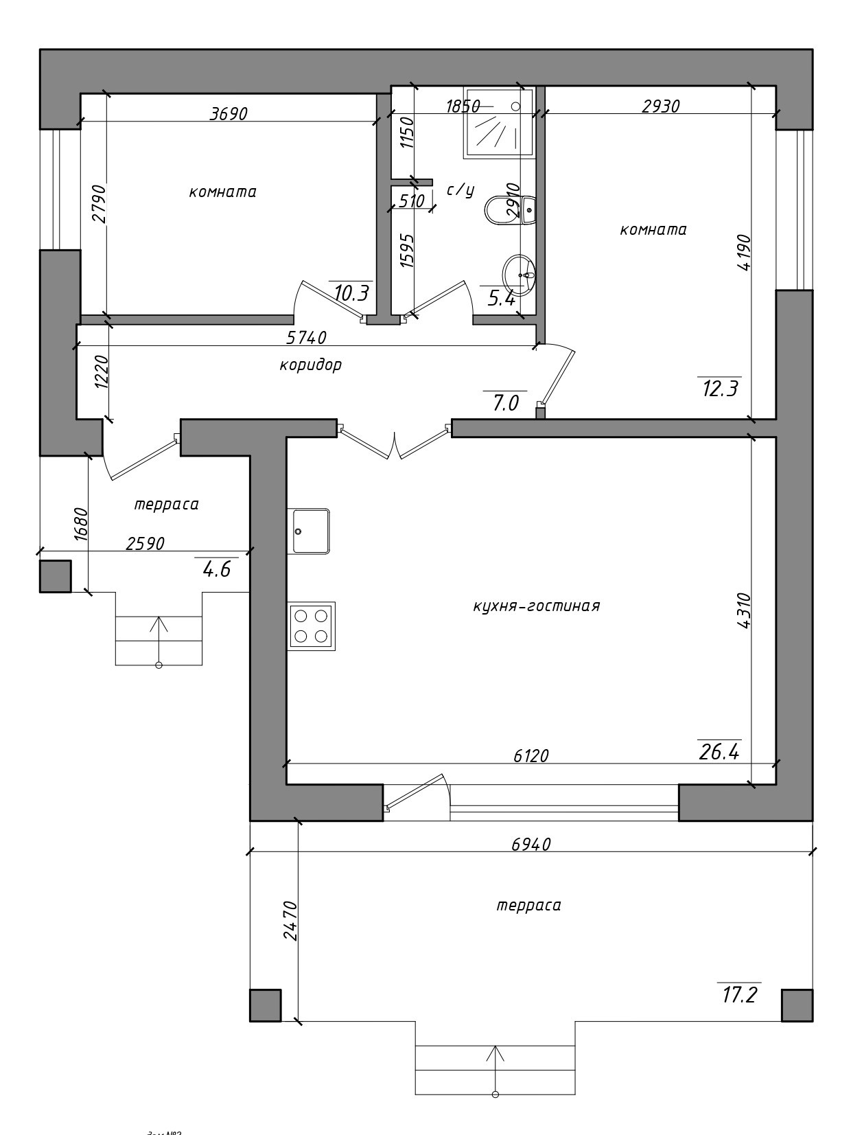 2 изолированные комнаты, большая кухня-гостиная, санузел
